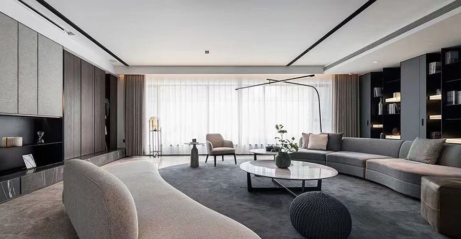 帶有磨砂質感的純色壁紙搭配上質感柔軟的布藝沙發,讓整個會客區域洋溢著舒適溫馨氣息。