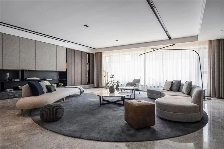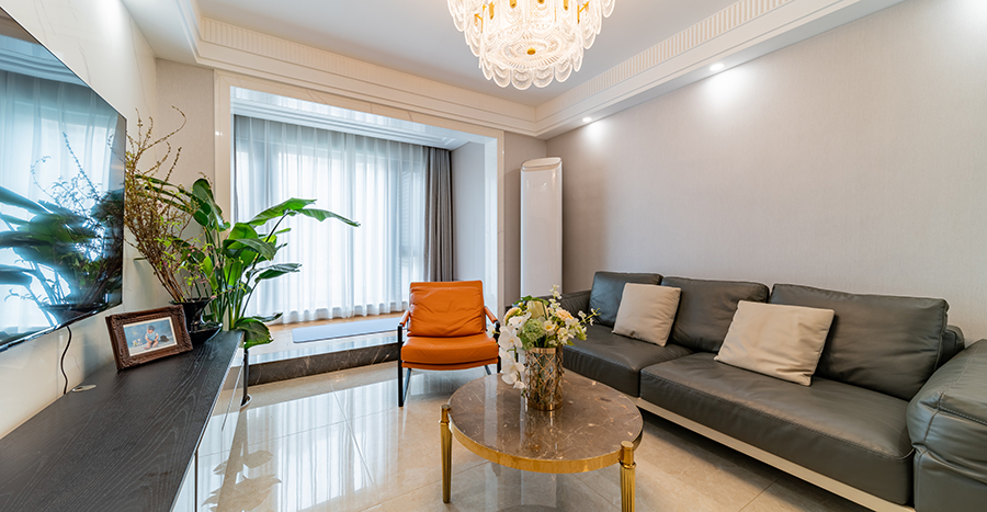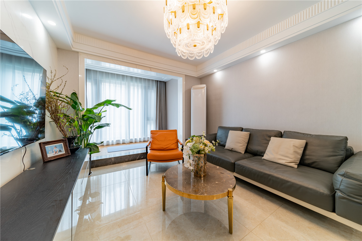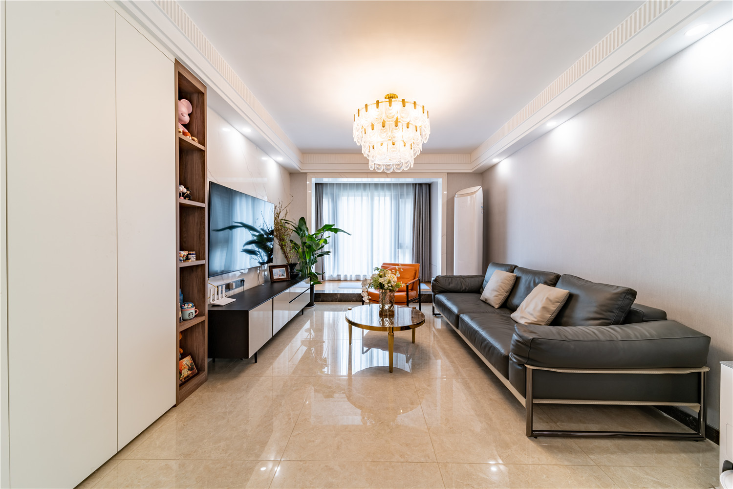 融創瀾岸的這套105㎡的三居室主宰整體的戶型結構相對比較平整,幾乎沒有太大的格局缺陷,因此空間設計難度不大。為了提升空間的實密度與美觀度,設計師將玄關處設置了一定的遮擋,避免室內景象直接映入來者眼前。同時,利用大面積落地窗設計,將室外的好風光進入室內,起到較好的室內裝飾點綴效果。