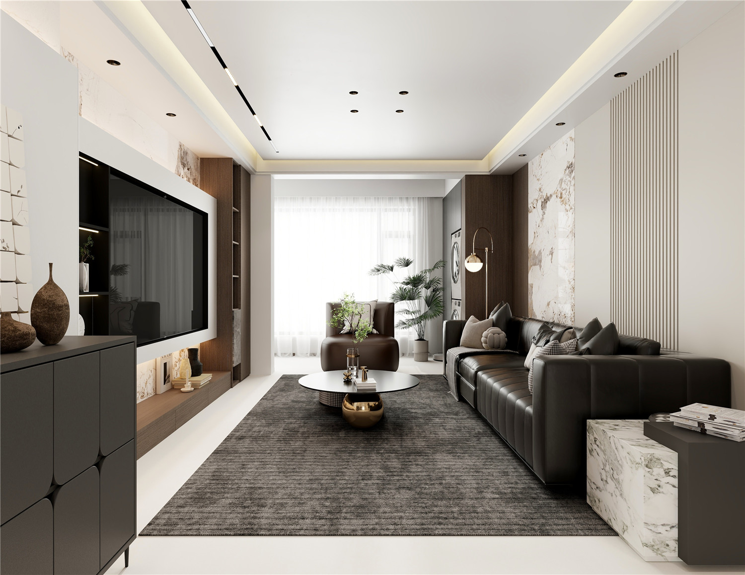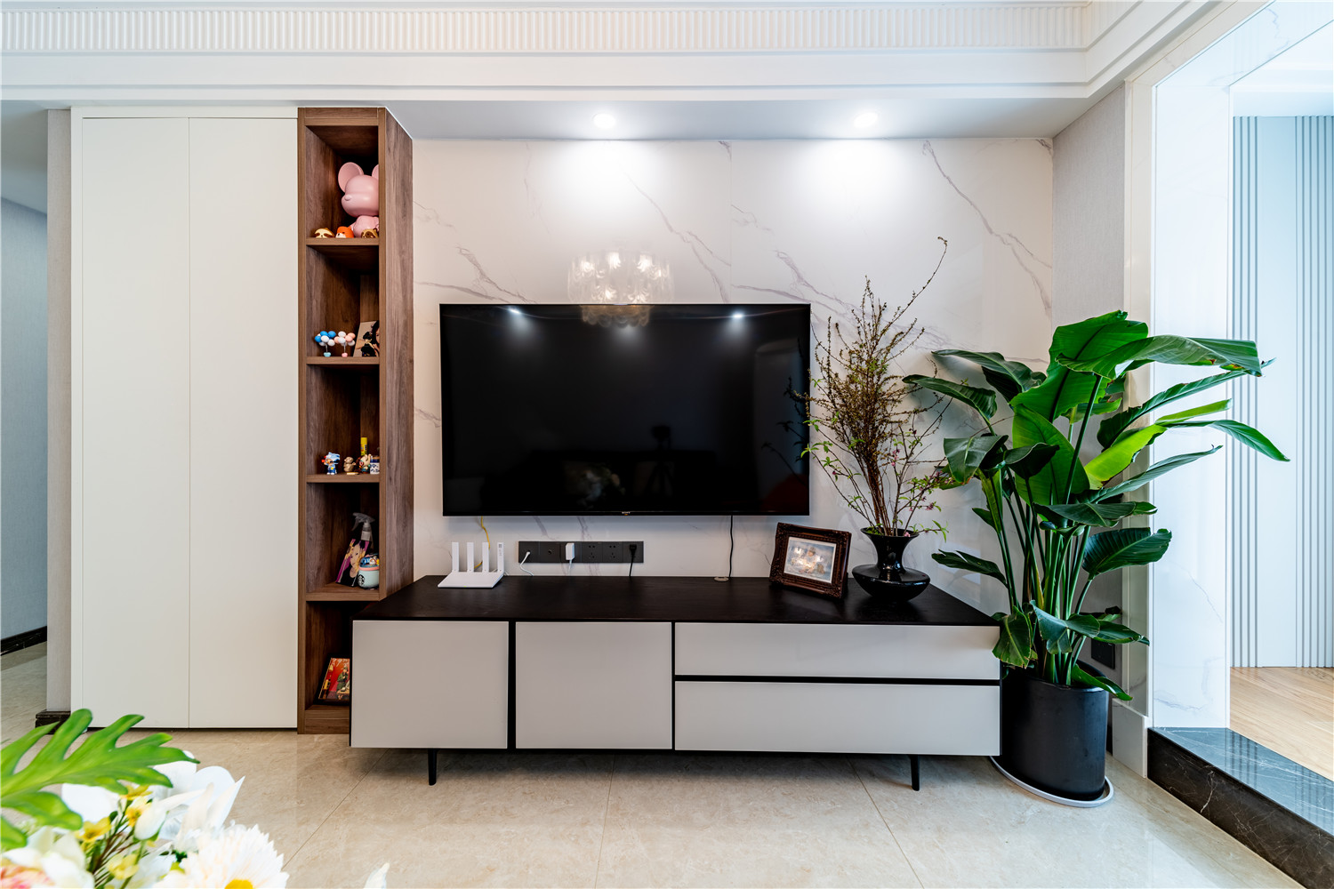 大理石打造的電視背景墻清新而又不失高貴感,搭配上對稱式木質結構,平添一抹溫厚柔和之美。