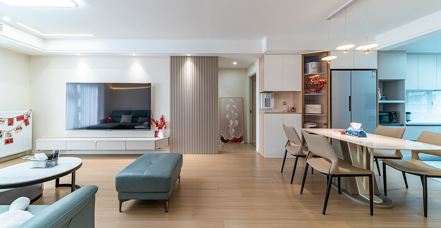荷景苑這套128㎡的四居室住宅整體戶型四平八穩,而空間結構上,入戶處的面積相對比較寬敞,如果僅僅用來做玄關相對比較浪費,因此設計師將該空間分隔成兩個區域,其中一塊設計為廚房,以提升空間的利用率。主臥區域則與其中一個衛生間空間進行銜接融合,提升主人起居生活的便利度。