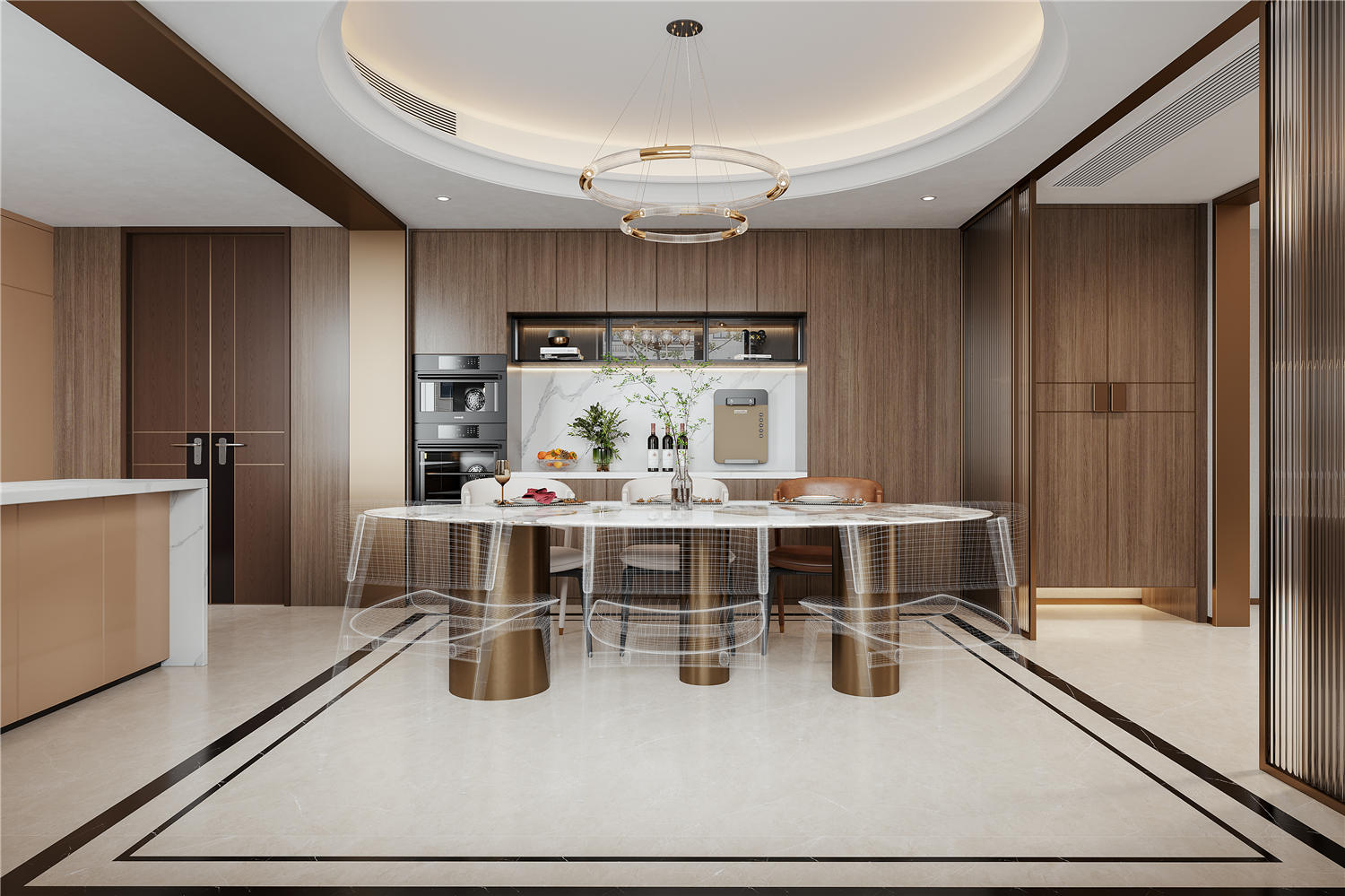 2 餐廳設置操作柜,提升利用率,滿足各種廚電的擺放。