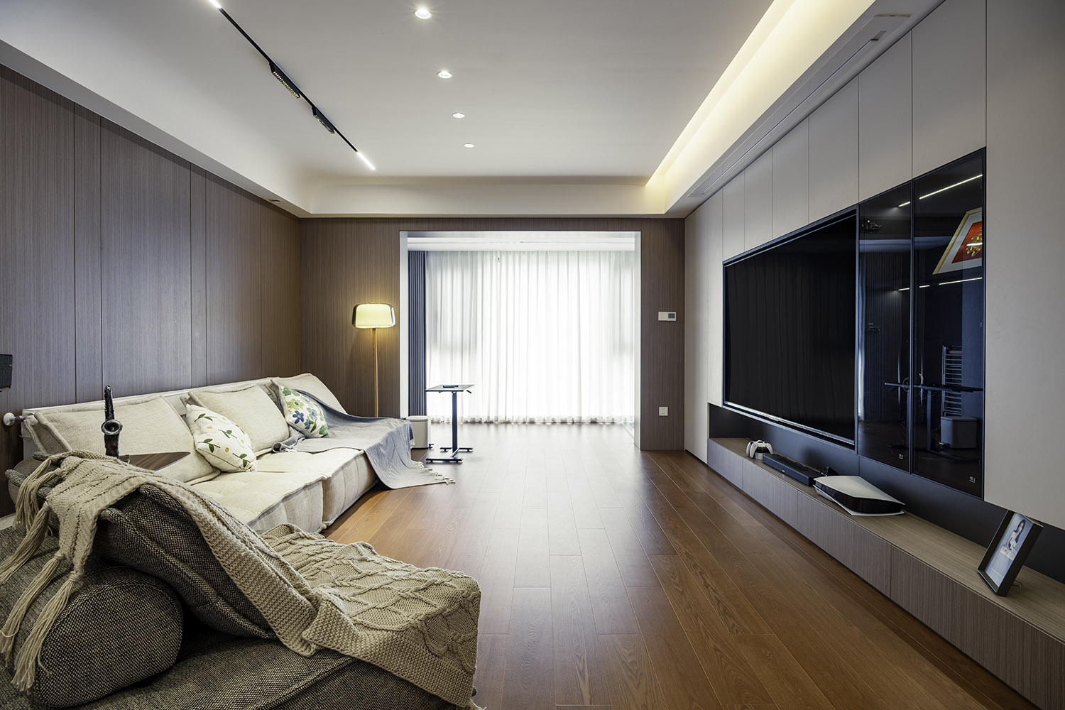 2 玄關到客廳設置一整墻背景柜,視覺大氣純凈,同時增加收納空間。