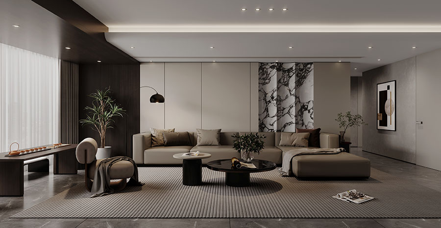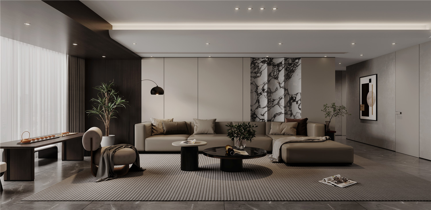 陽臺客廳選用大塊地磚通鋪,讓二者空間合并,形成功能空間和休閑空間,增大室內活動區域,讓生活更便捷。