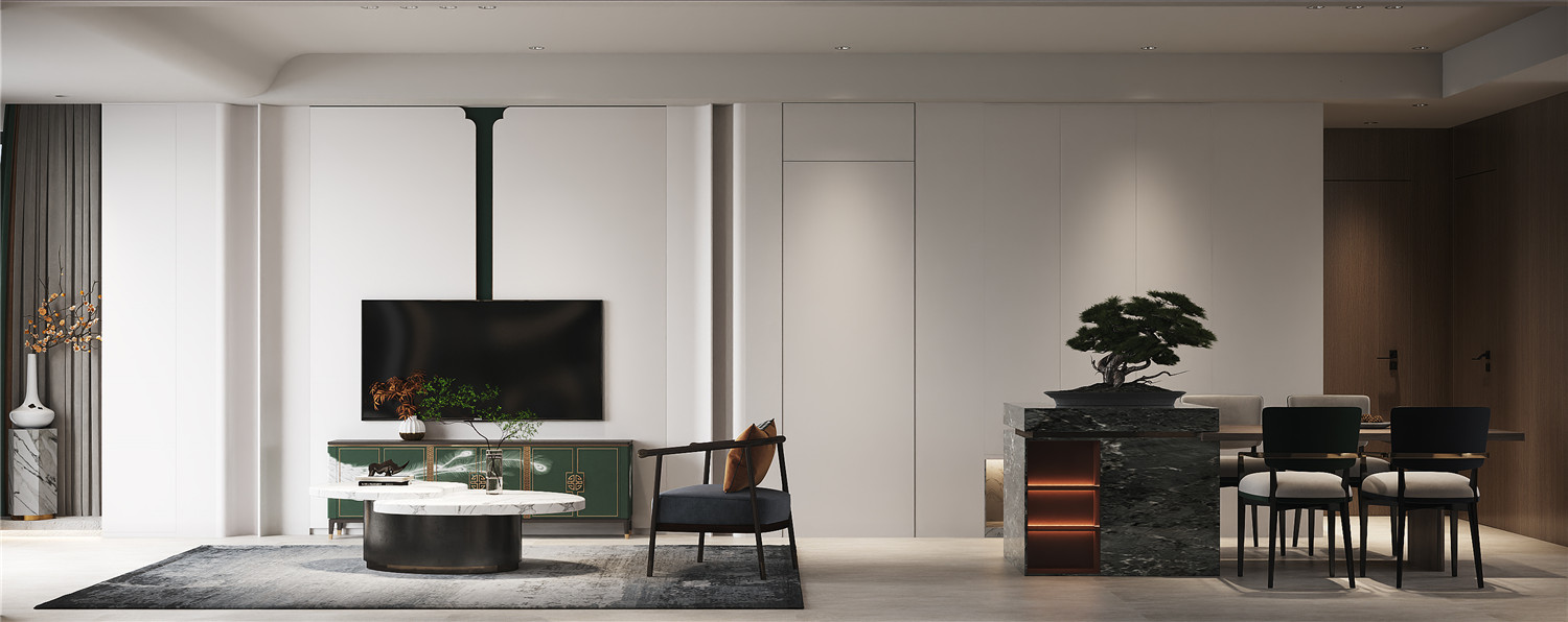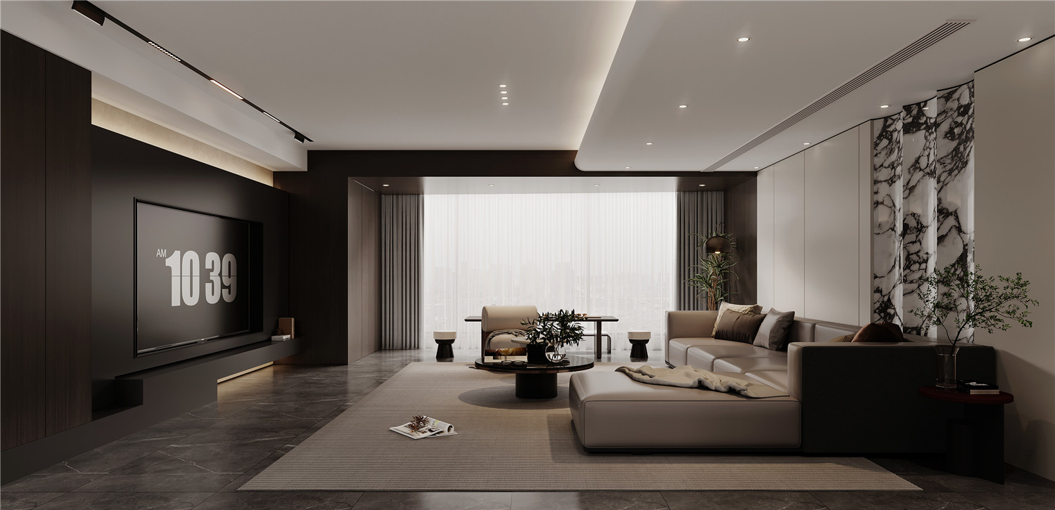 頂面的石膏線條簡約干練,加以局部金屬線條點綴,勾勒出空間層次,提升了整體質感。墻面以實木墻板和墻布搭配鋪陳,簡單置入一幅裝飾畫,凝練出溫馨雅致的空間語言。造型古樸的電視柜搭配有質感的皮沙發與柔軟的細麻布藝窗簾,意外的美觀和諧,呈現出溫馨的家居氛圍,更透露出一絲文化底蘊。