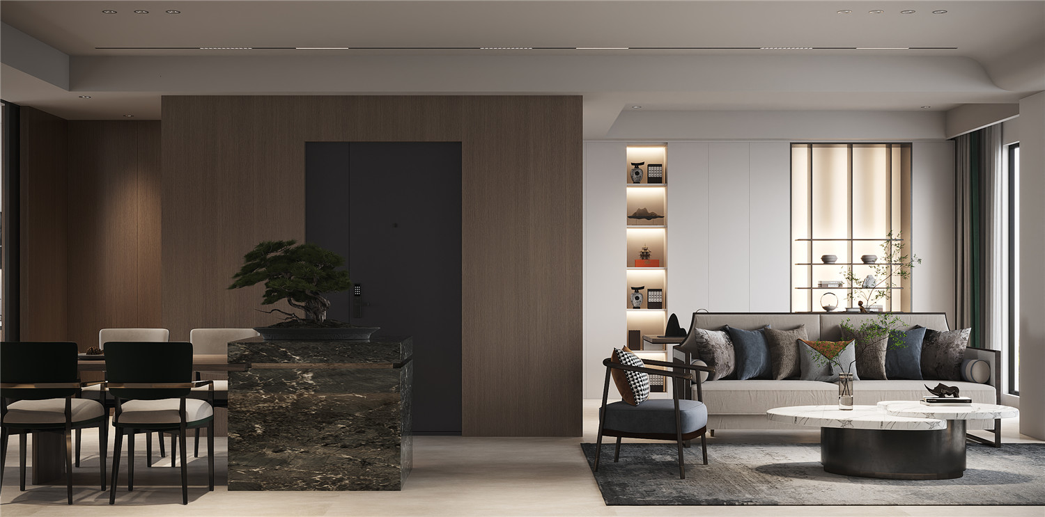 對此,設計師選擇打開廚房,將空間擴大,形成餐廚一體結構,并于餐廳增設西廚臺面,解決臺面和冰箱問題。玄關處用鞋柜隔開過道和餐廳,形成雙動線,讓空間更加通透和有趣。主臥室把衣帽間和陽臺書房利用進來,使空間更合理,功能更強大。