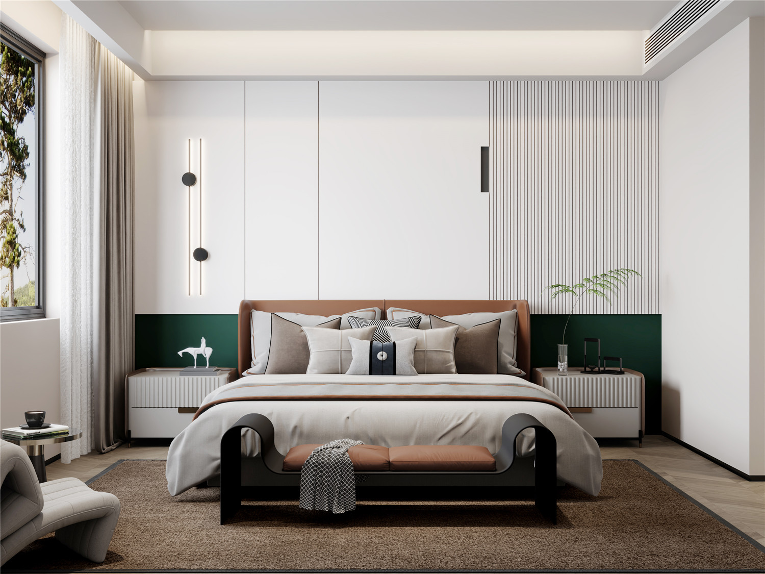 業主家的小男孩較為活潑,墻面選用了他喜歡的宇航員遨游太空墻布,滿足其對未知探索的好奇心。沒有過多的裝飾點綴,整體的材質搭配簡潔富有層次,讓人更好的放松下來,輕松入眠。