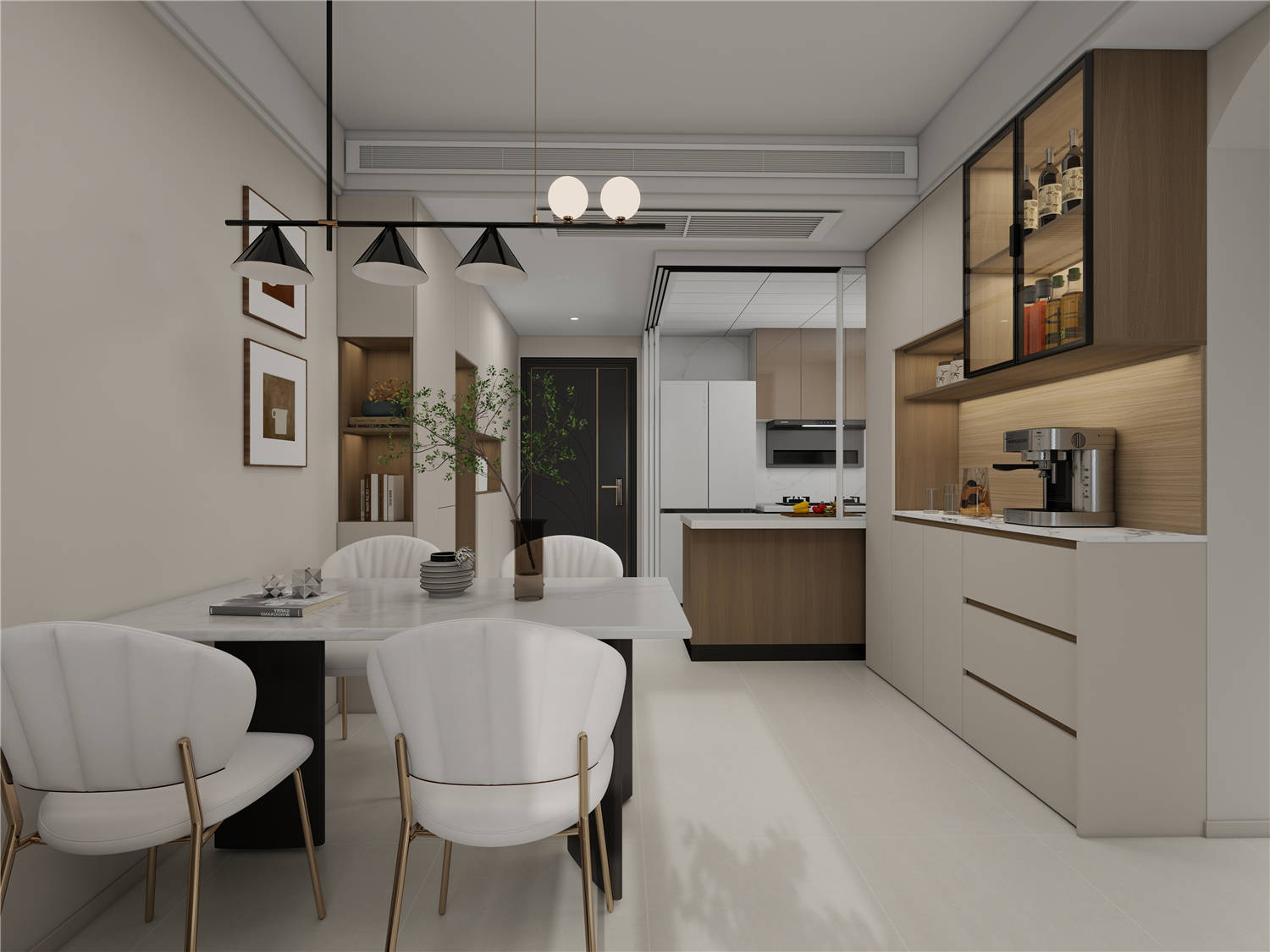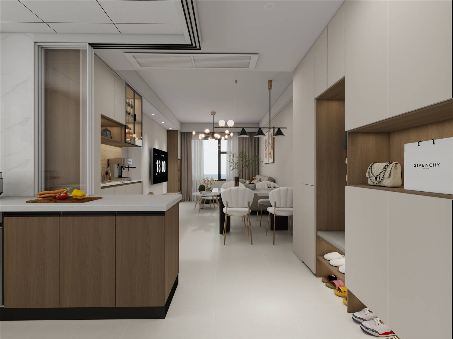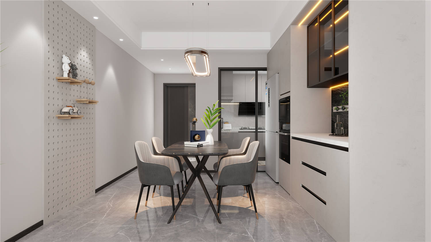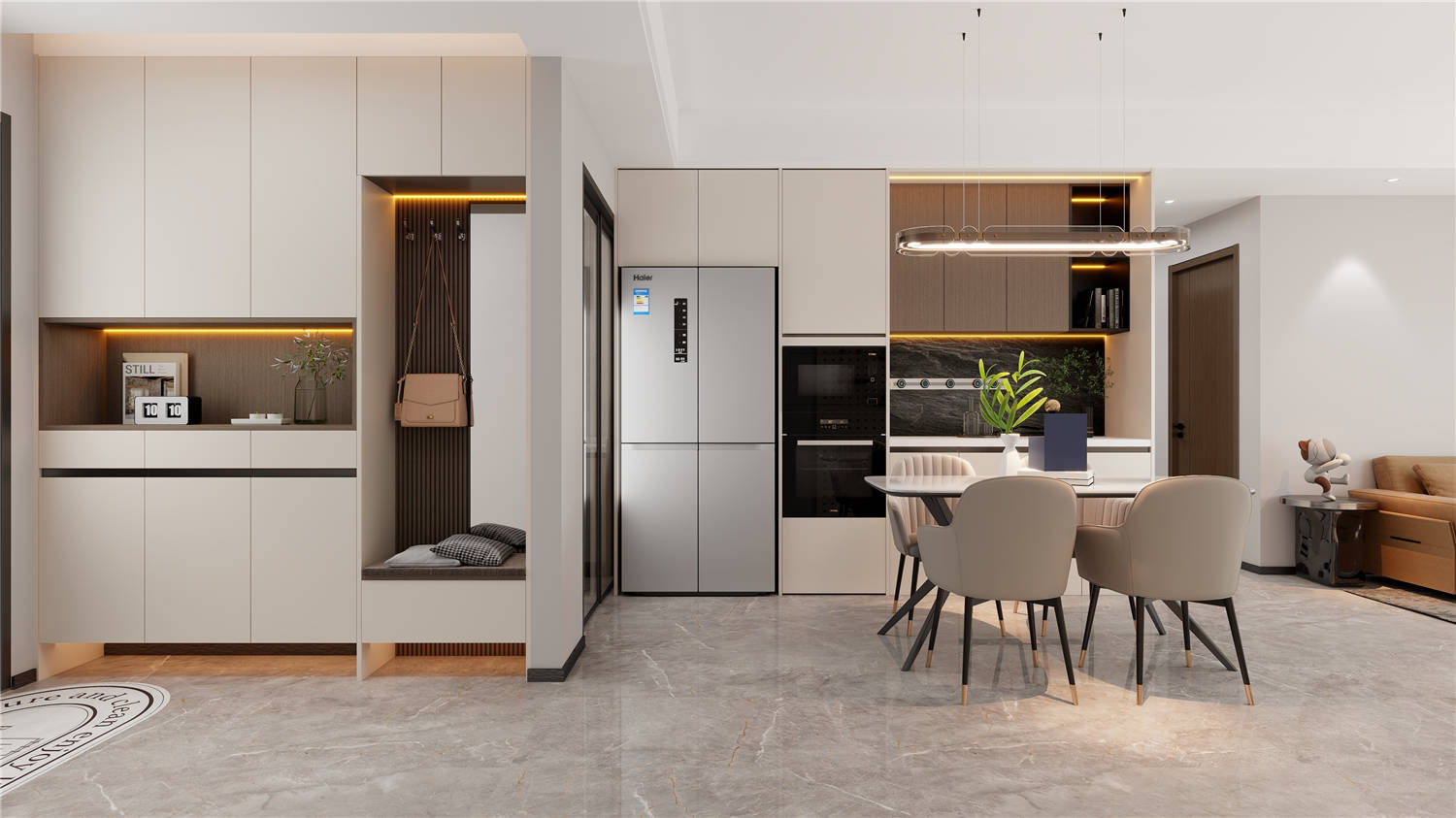這個家的餐廳與玄關區域巧妙融合,定制玄關柜與嵌入式餐邊柜緊密相連,冰箱被完美包裹,既體現了空間的連貫性,也為家居生活增添了品質感。