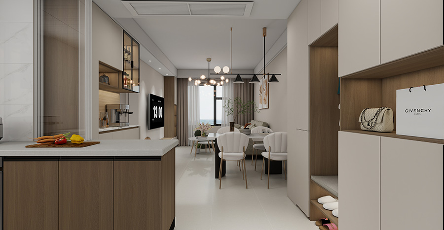 ① 借用部分客房空間,定制一體化鞋柜、餐邊柜,并嵌入冰箱,打造整齊空間。