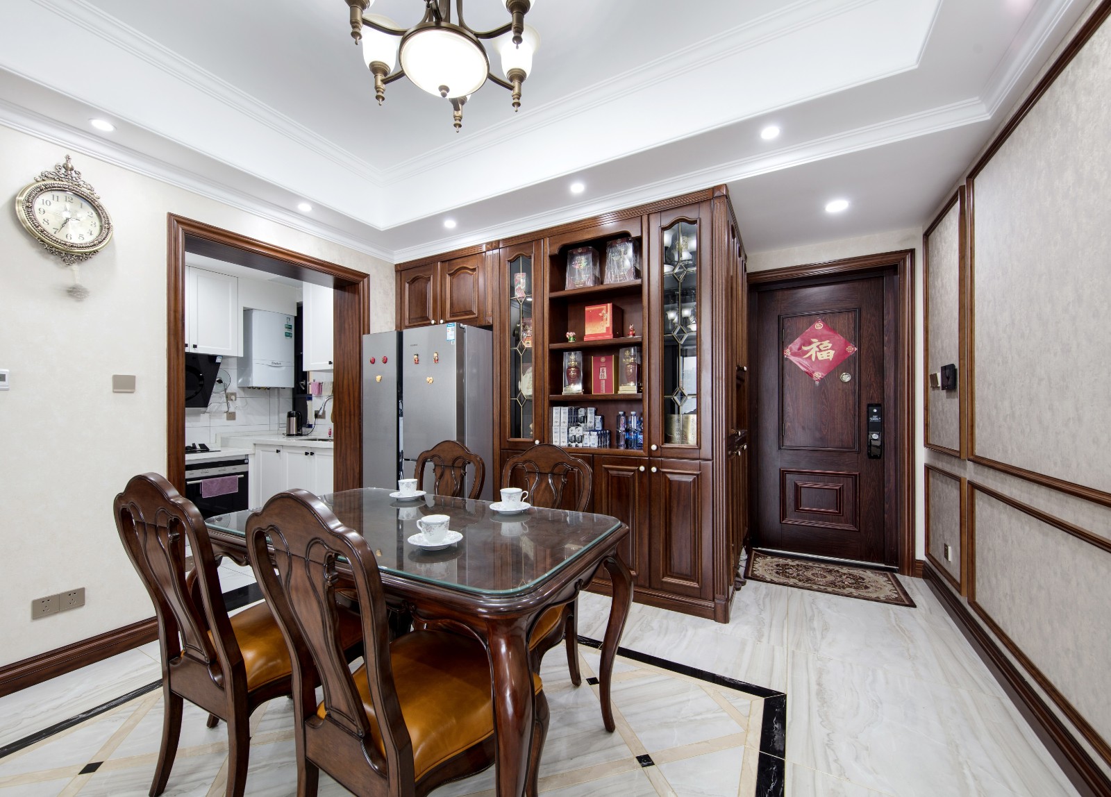 胡桃木家具搭配上造型簡約的吊燈就構成了就餐區域的軟裝,整體造型簡約而又耐看,同時不會占用較多空間。