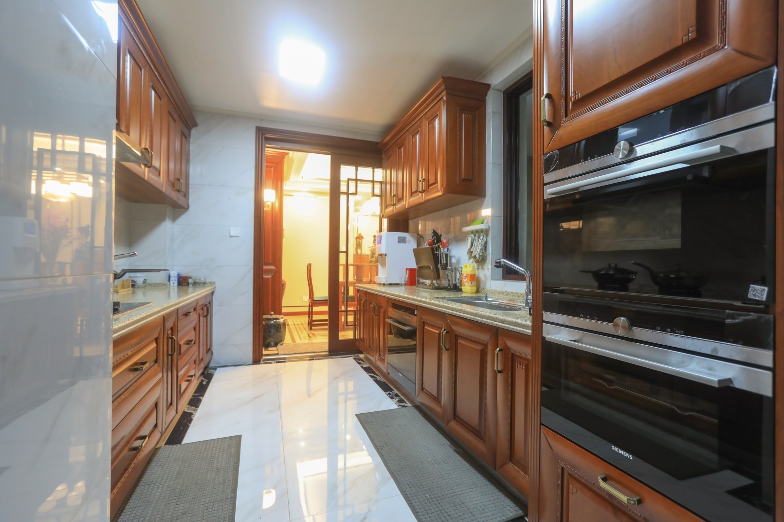 這套位于綠地金融國(guó)際城的四居室房屋面積雖然在220㎡左右,但是由于戶型并不方正平整,且存在著零碎角落,因此存在著較大的設(shè)計(jì)難題。為了讓所有的空間都得到合理的充分利用,化解戶型缺陷,設(shè)計(jì)師對(duì)空間進(jìn)行了再規(guī)劃,將入戶處左邊的狹長(zhǎng)條區(qū)域打造成廚房,利用戶型的轉(zhuǎn)折減少油煙進(jìn)入生活空間的概率。同時(shí)將該區(qū)域進(jìn)行一定的再切割,規(guī)劃出一塊置物空間,有效提升了家居空間的利用率。