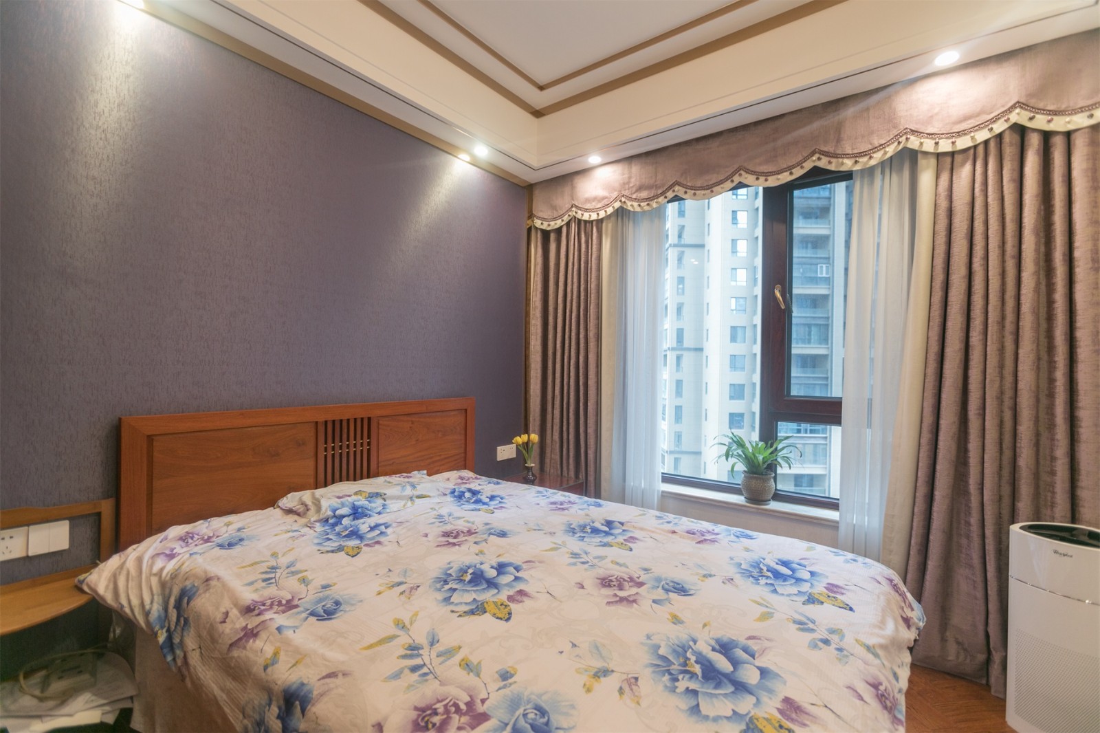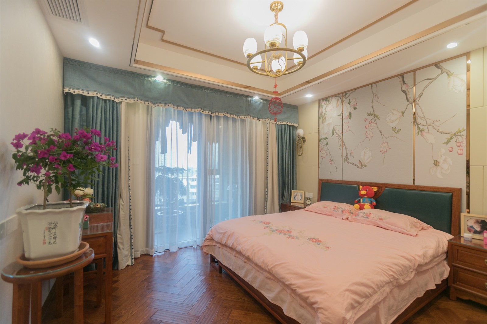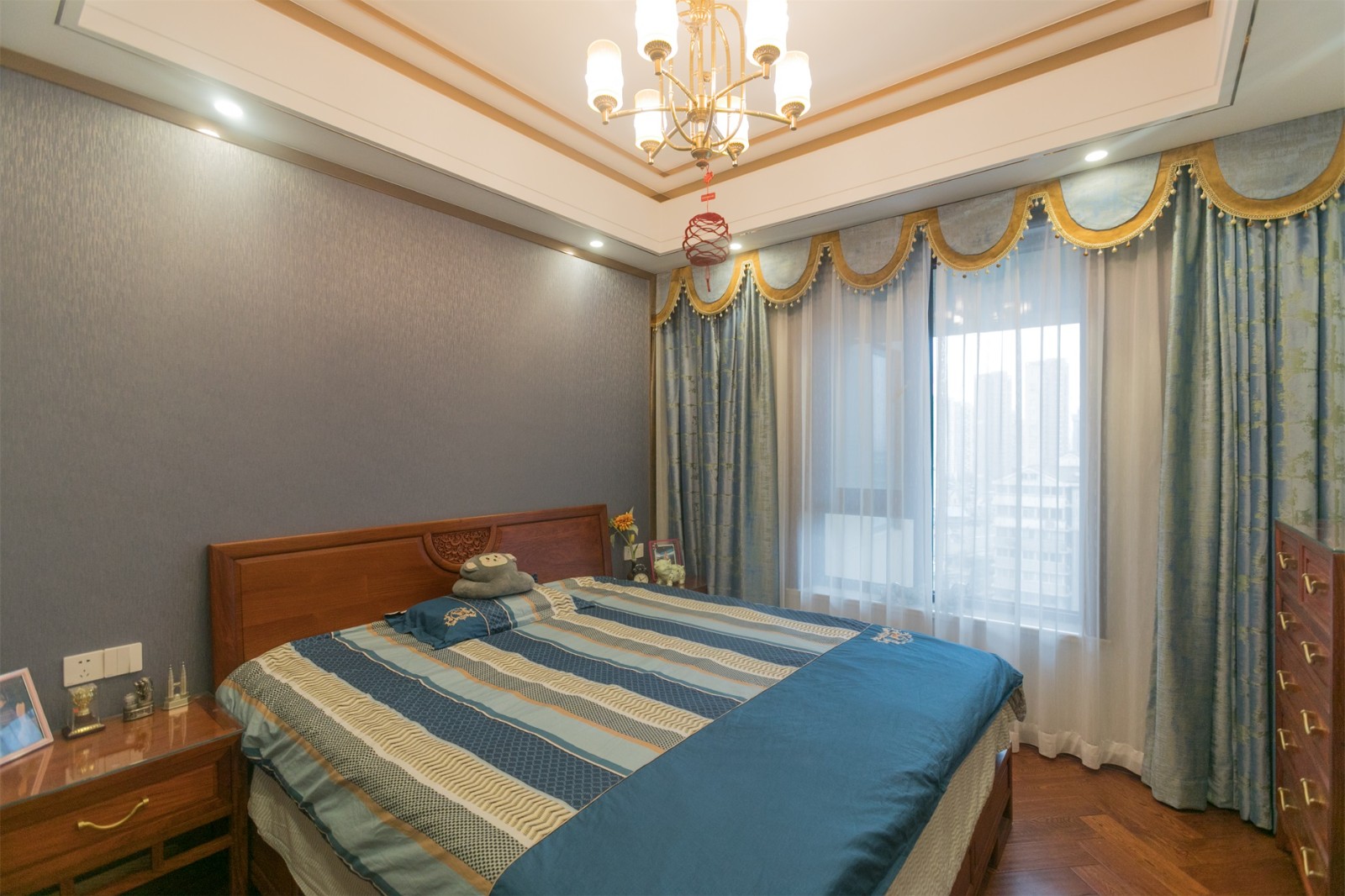 古色古香的臥室門、做舊復(fù)古的吊燈、鑲邊處理的吊燈讓臥室洋溢著一股古韻氣息。而淡藍(lán)色的床具則讓空間多一抹輕快明麗的氣息。