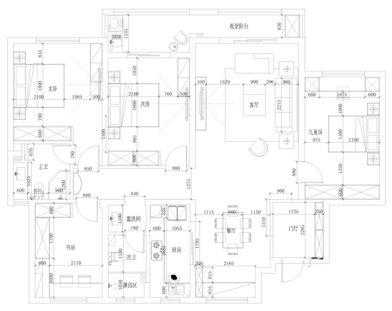 復地東湖國際這套170㎡的四居室住宅戶型相對比較平整方正,而由于入戶門在房屋偏角處,因此設計師在進行規劃設計時就利用入戶門軸向作一個劃分,將作伴區域作為業主的辦公、休憩區域、中間則設置為會客區域,右邊則打造為兒童房,有效提升了各個功能區域的劃分。