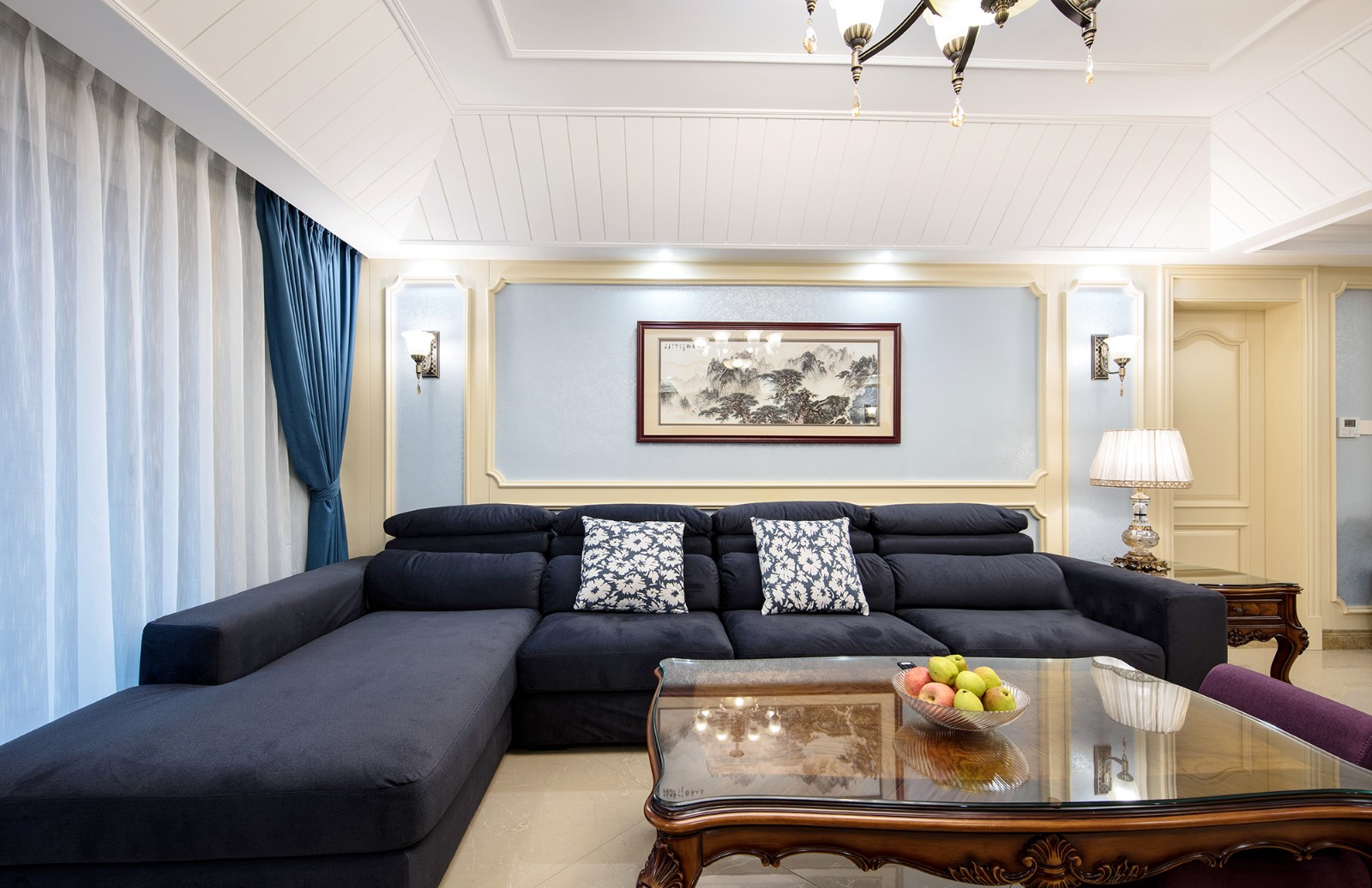 淺藍色墻面搭配上簡約的風景畫,一種悠然自得的清新感流淌在空間。而柔軟的深灰色絲絨沙發,則為空間增添了品質格調。