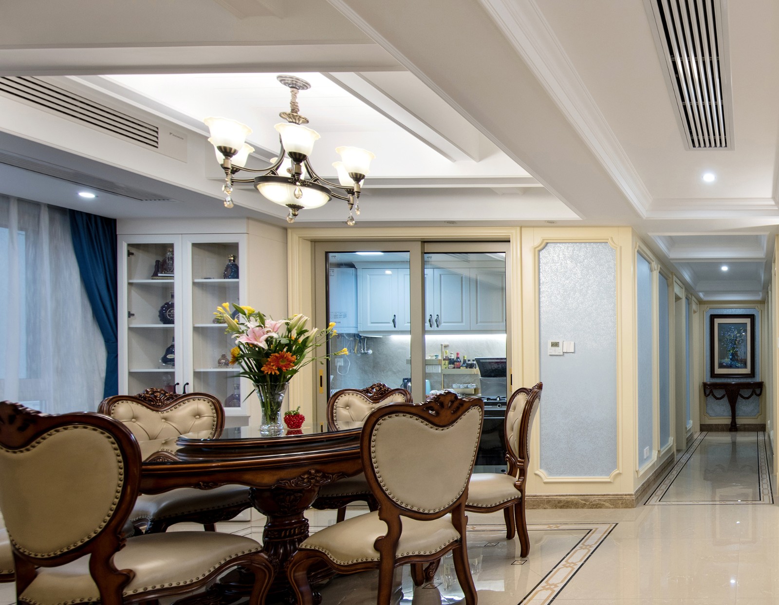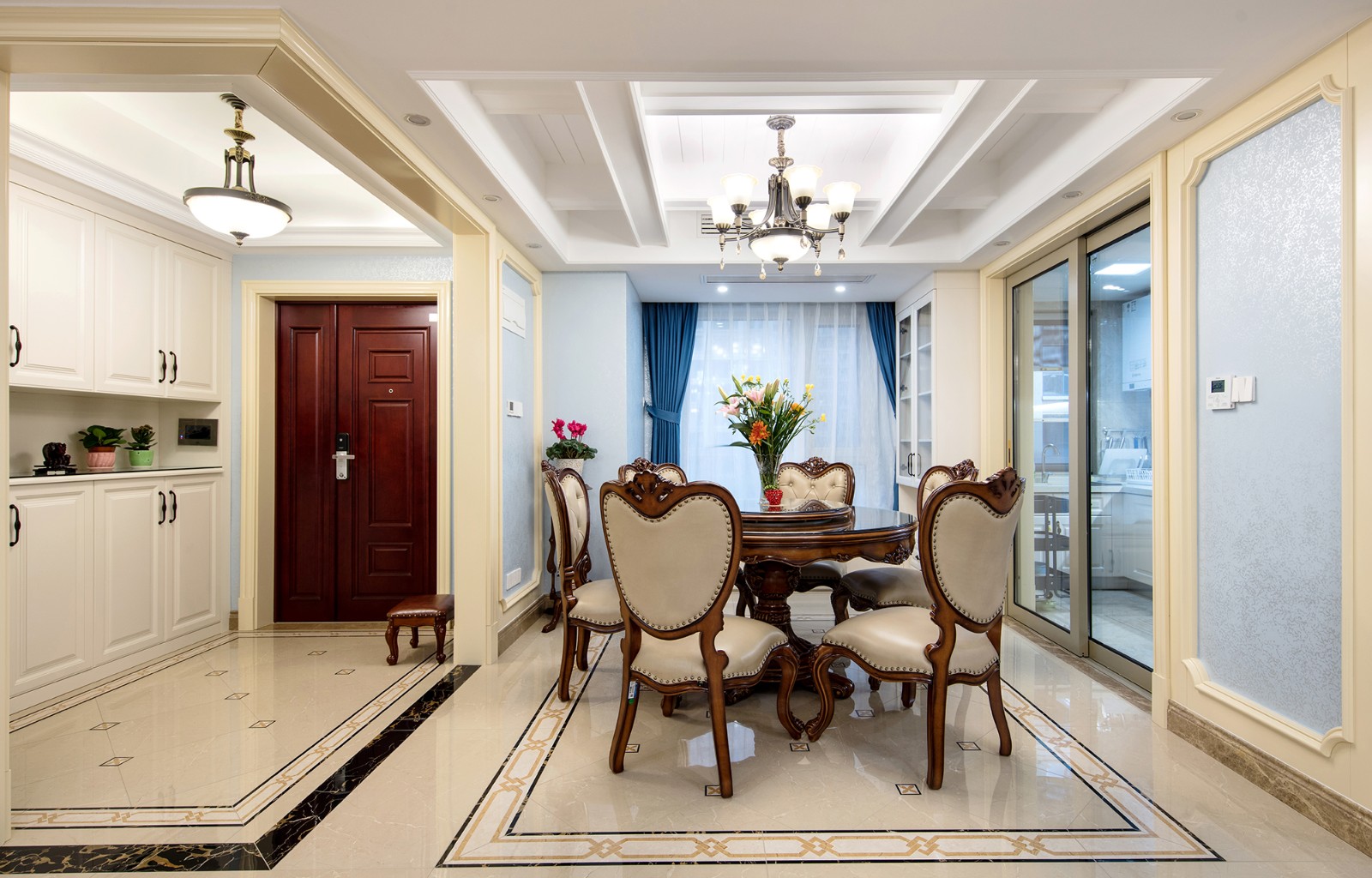 淡藍色的墻面為就餐區域增添了一抹清新明麗的氛圍,而造型優雅的餐座椅則讓整個就餐區域多了一抹精致的浪漫感。
