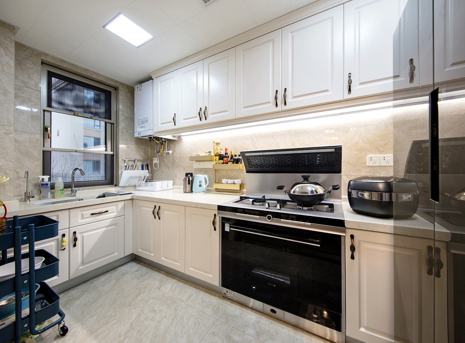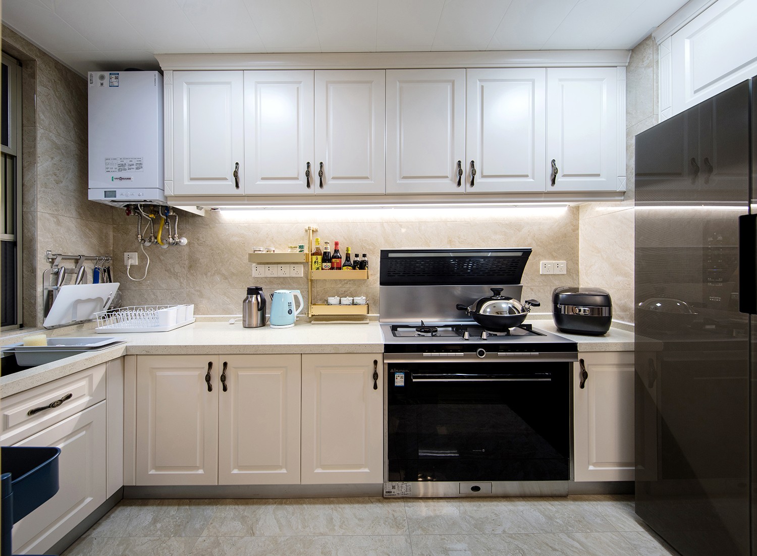 大面積的淺色瓷磚確保了廚房油煙能夠得到更好的清理,而懸掛式櫥柜的存在則有效提升了空間利用率。