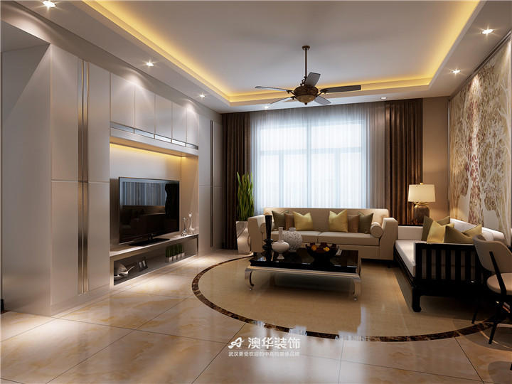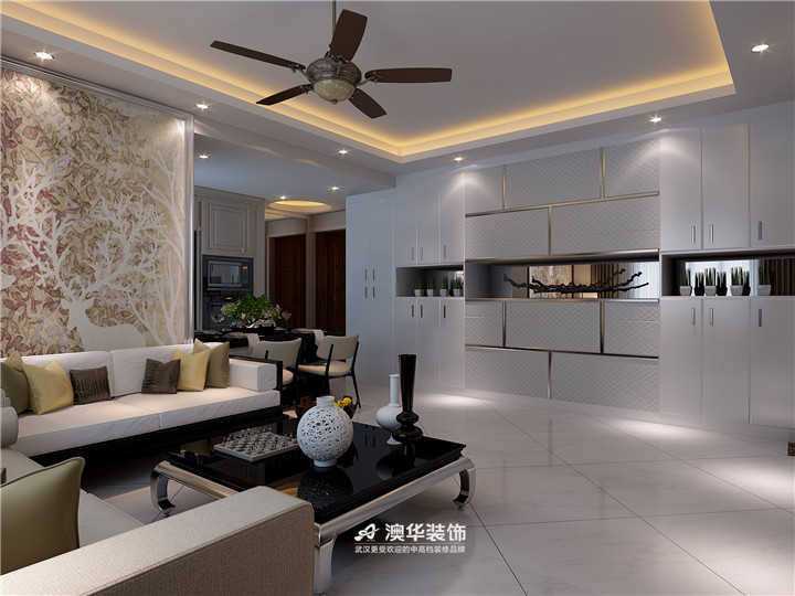 整體以白色為主,頂面和電視墻燈帶相互糅合后,呈現(xiàn)出獨(dú)特的視覺觀感,布藝沙發(fā)圍合式放置,滿足了家庭日常社交需求,地面增置圓形地毯,與方形吊頂對(duì)立碰撞,提升了空間的層次感,沙發(fā)左側(cè)空間設(shè)以收納柜面,簡(jiǎn)單的線條勾勒出時(shí)尚沉穩(wěn)的力量。