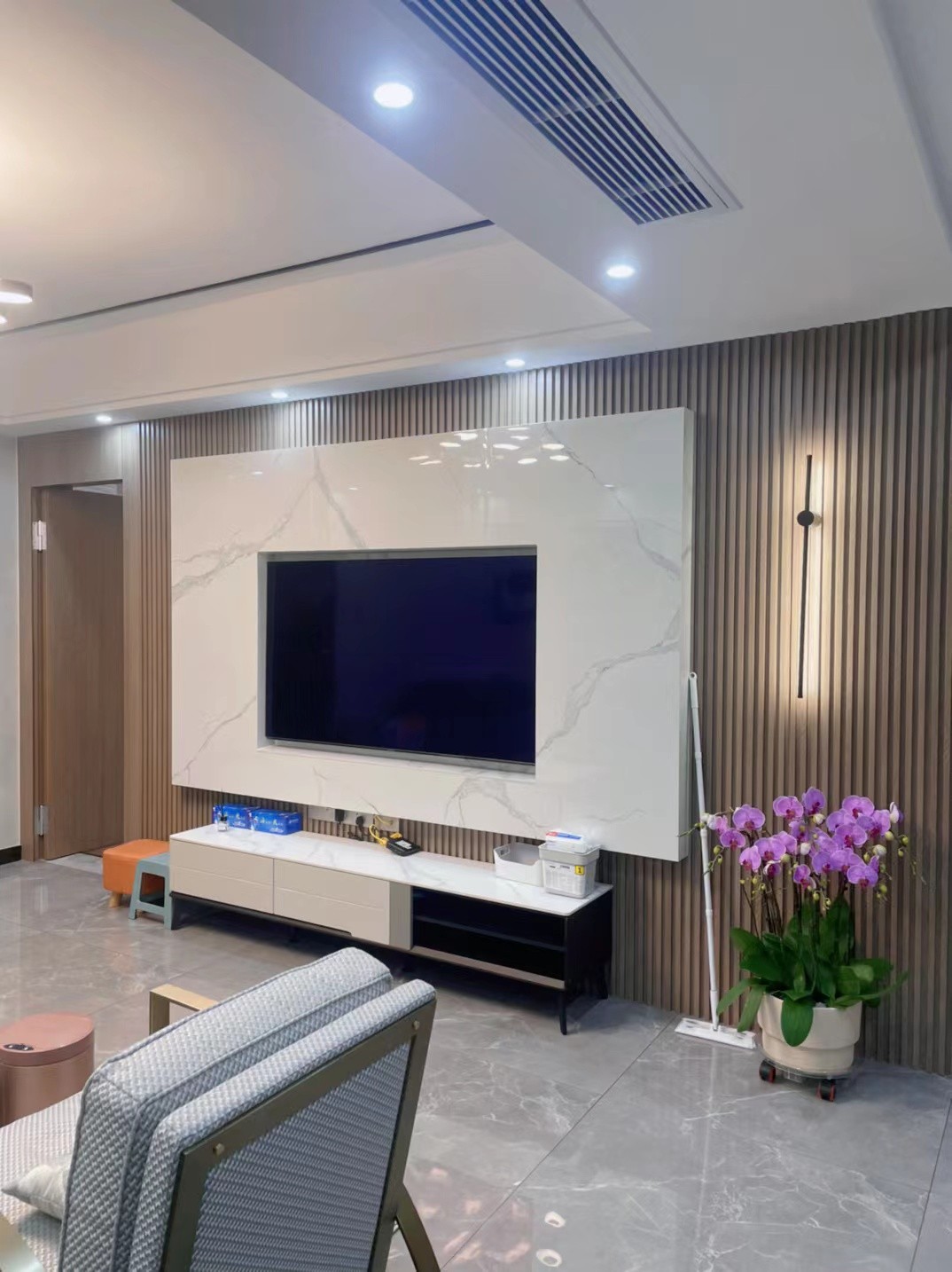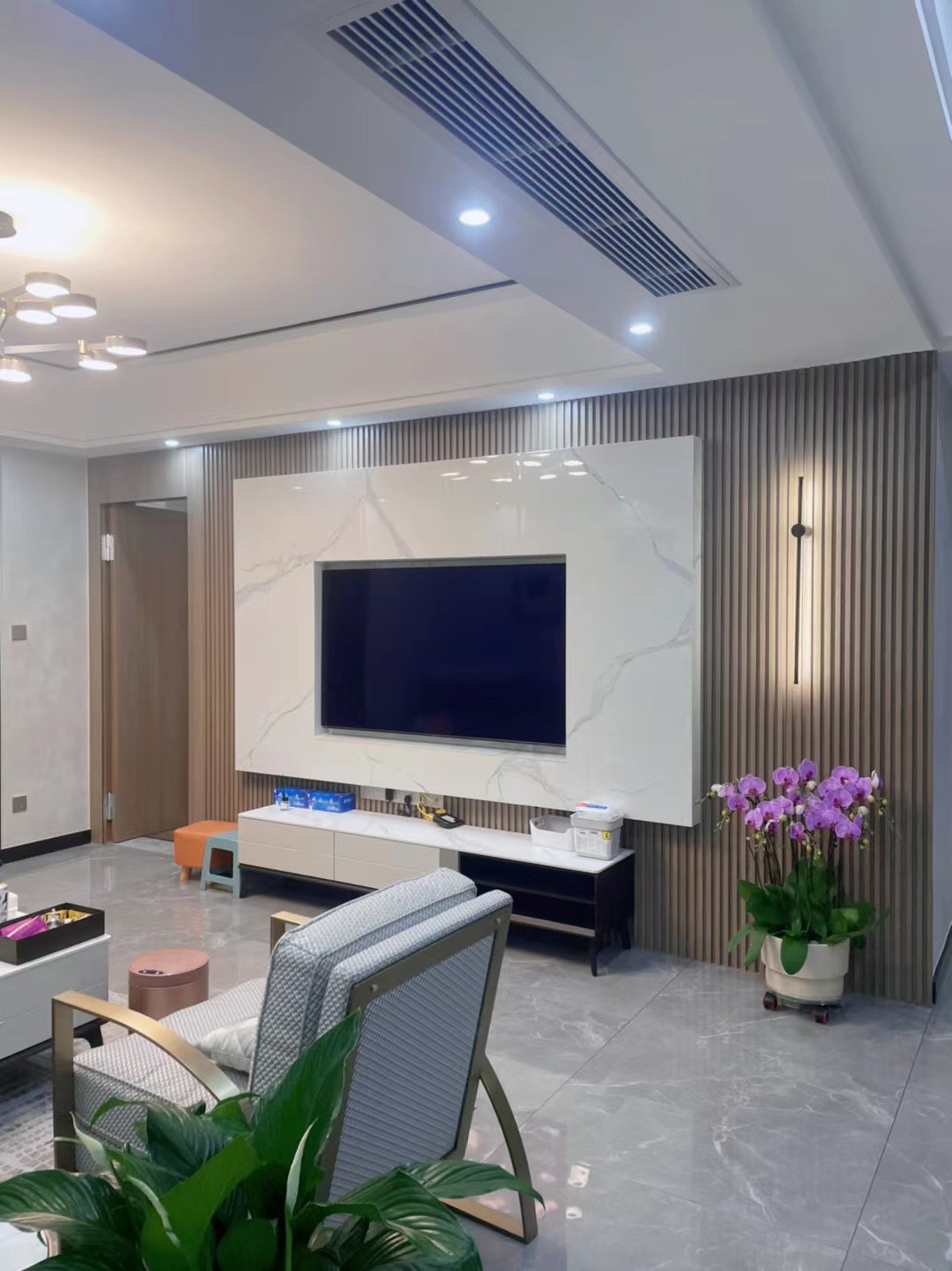 由木質(zhì)與大理石材質(zhì)打造的電視背景墻清新而又不失理性,鏤空的設(shè)計(jì)則讓空間的通透感更加強(qiáng)烈。