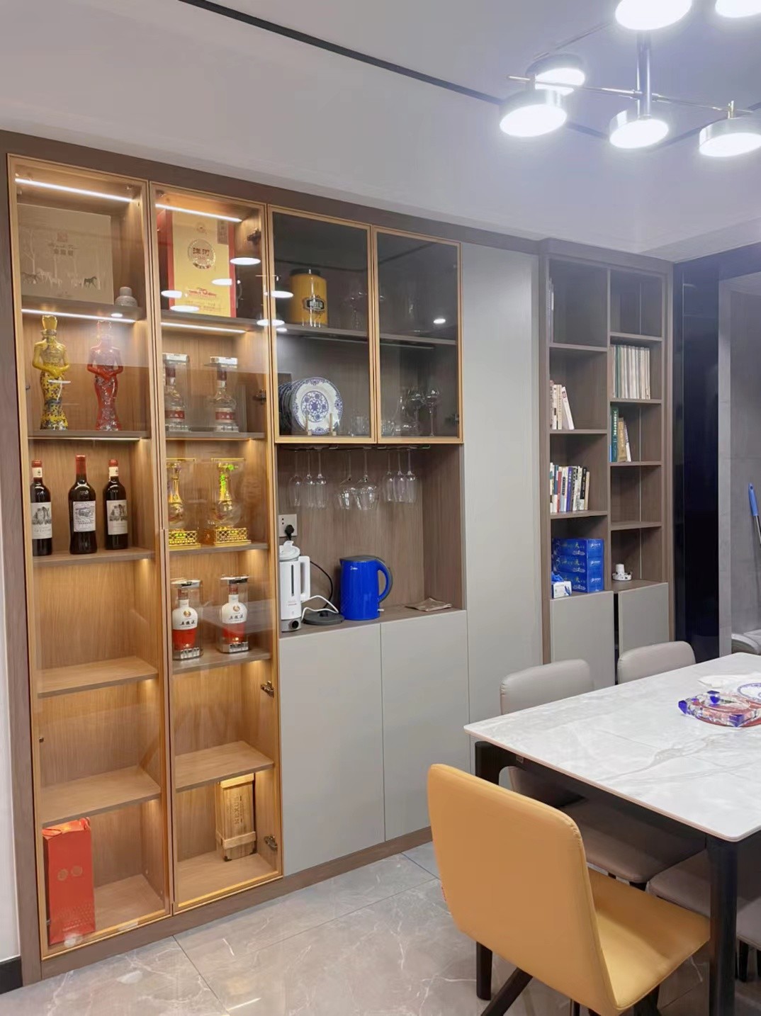 案例簡(jiǎn)介:本案例的業(yè)主是一對(duì)即將退休的夫婦,其中男主人偏愛品酒,且平時(shí)也會(huì)收藏一些好酒,因此在裝修設(shè)計(jì)這塊希望能夠預(yù)留出自己的小天地。而女主人公平常負(fù)責(zé)家務(wù)比較多,因此裝修設(shè)計(jì)這塊更看重的是整體的耐看性與是否便于打理。綜合兩位業(yè)主的需求,設(shè)計(jì)師對(duì)空間進(jìn)行了再分割,同時(shí)在室內(nèi)融入酒柜設(shè)計(jì),以滿足男主人的需求。
