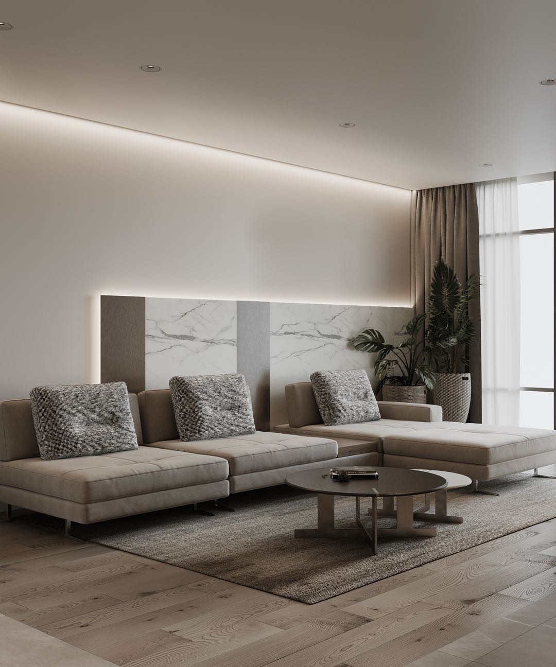 華潤(rùn)翡翠城這套四居室的占地面積約為138㎡,戶型結(jié)構(gòu)呈現(xiàn)長(zhǎng)方形,原有的功能區(qū)域已經(jīng)大致完成,而由于客廳區(qū)域面積過(guò)于狹長(zhǎng),因此設(shè)計(jì)師在進(jìn)行規(guī)劃的時(shí)候借助軟隔斷分隔出一個(gè)就餐區(qū)域,以避免會(huì)客區(qū)域顯得過(guò)于空蕩。大面積的陽(yáng)臺(tái)則利用大面積的玻璃設(shè)計(jì)將室外景觀帶入室內(nèi),再搭配以簡(jiǎn)約的家具,滿足業(yè)主們觀賞自然美景的需求。