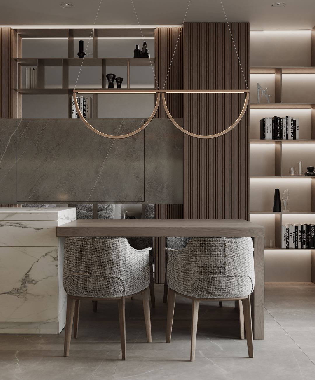 大面積的木質(zhì)材料搭配上帶有天然紋理的大理石臺(tái)面,整體給人以古樸清新的自然韻味感。