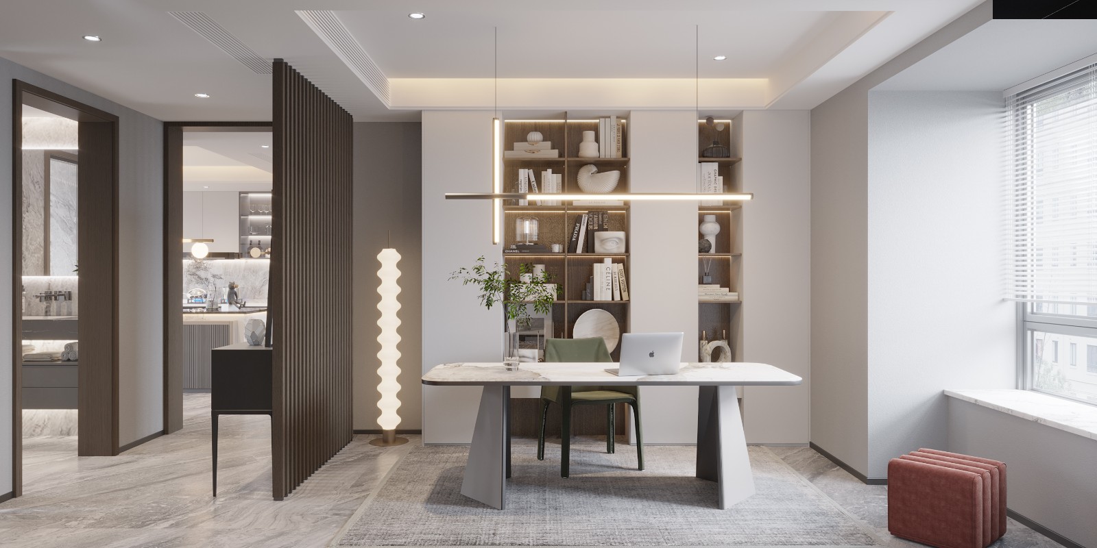 書房借助木質(zhì)柵欄進(jìn)行隔斷,有效提升空間藝術(shù)氛圍感的同時(shí)增添了區(qū)域通透感。
