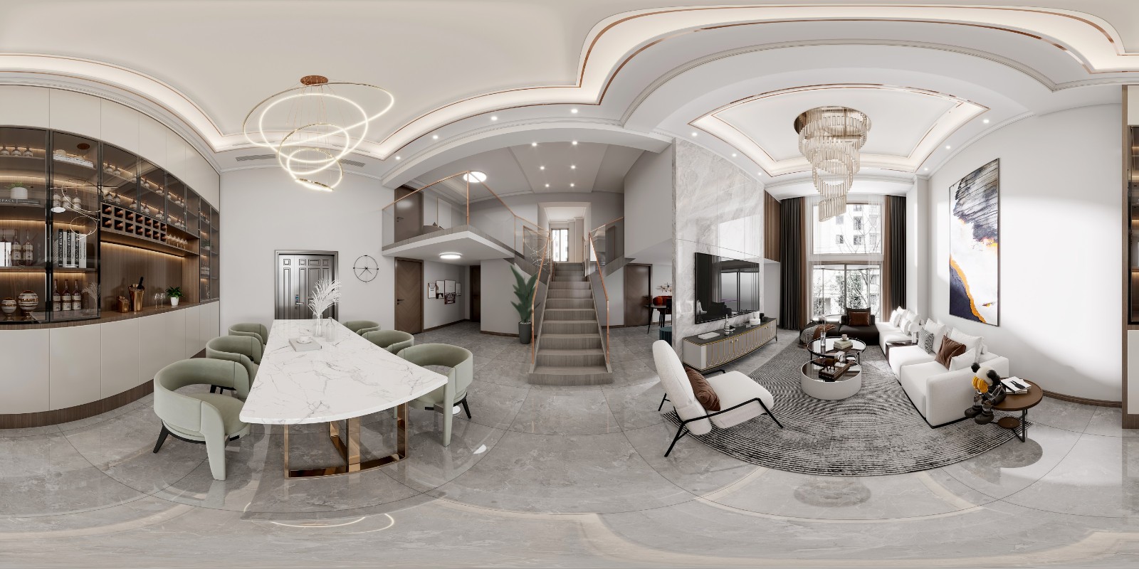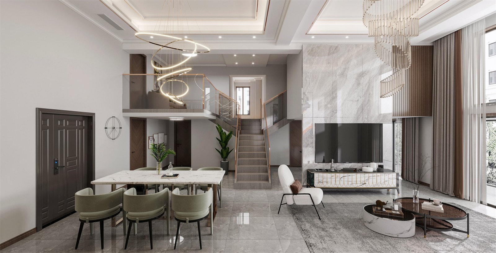 就餐區(qū)域被設(shè)置在一樓,借助大理石臺面打造餐桌,簡約而又不失輕奢高級感。