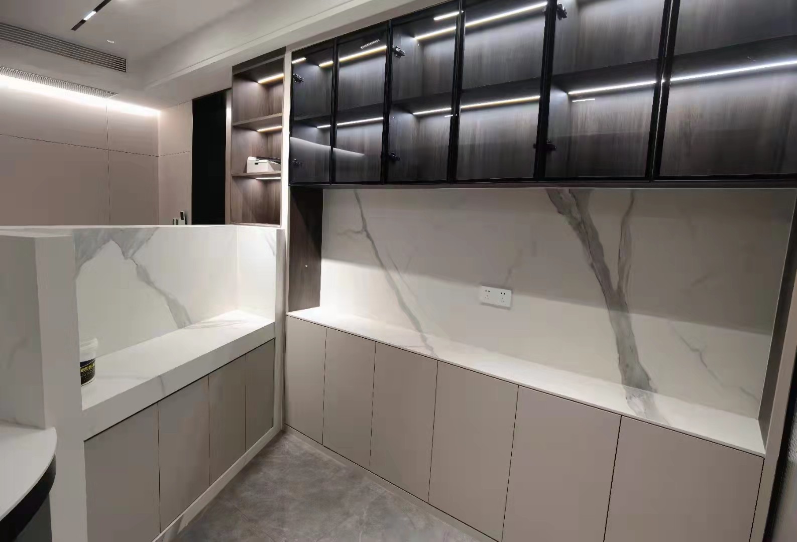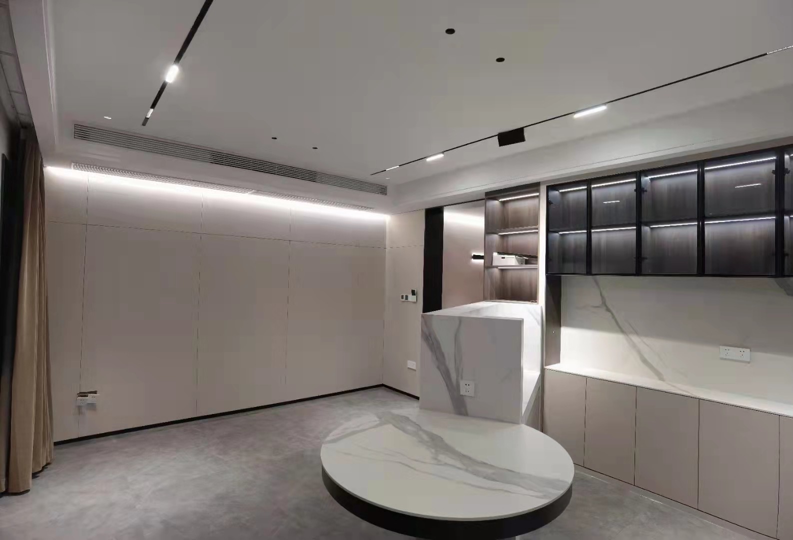 升降式臺(tái)面有利于節(jié)省空間面積,大面積的白色則從視覺上提升空間寬敞感。