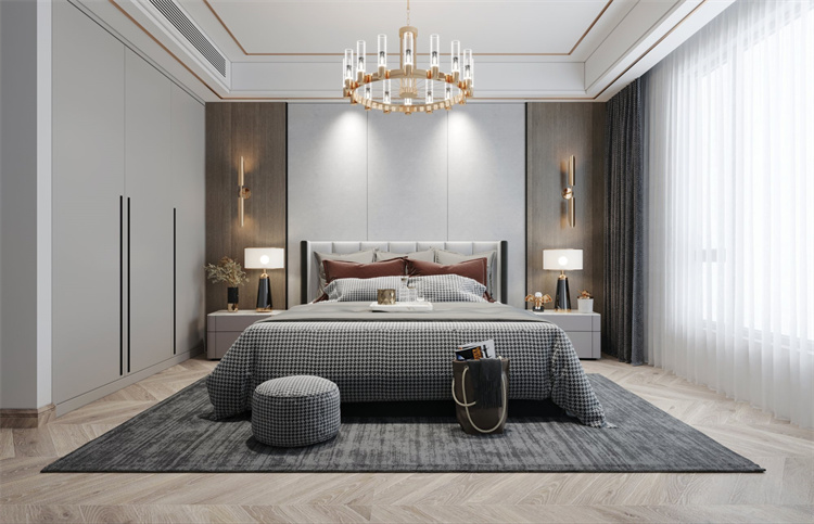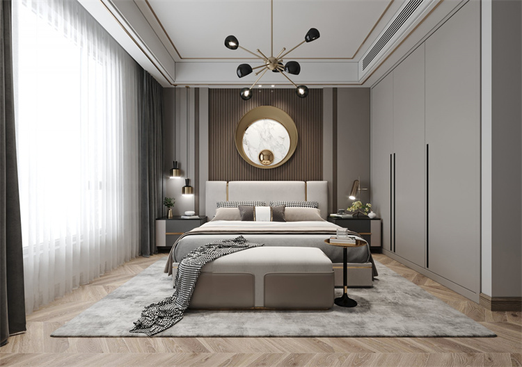 對稱式床頭設計給人以沉穩典雅氣息,放射式燈飾既吊頂處的金色鑲邊處理則平添高級格調。