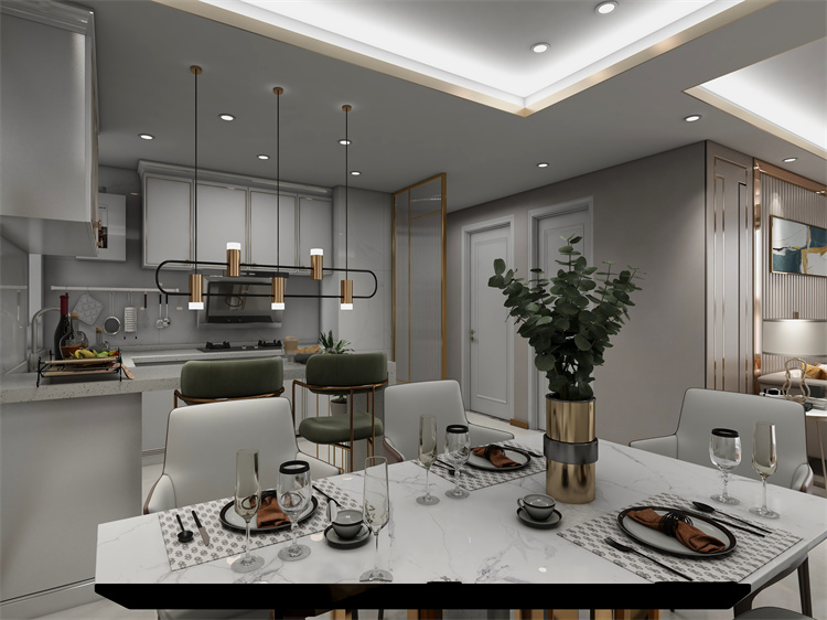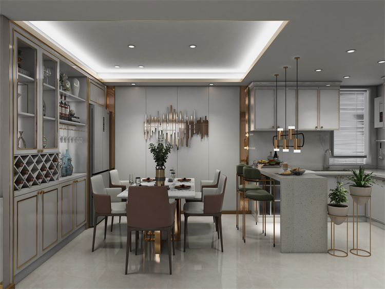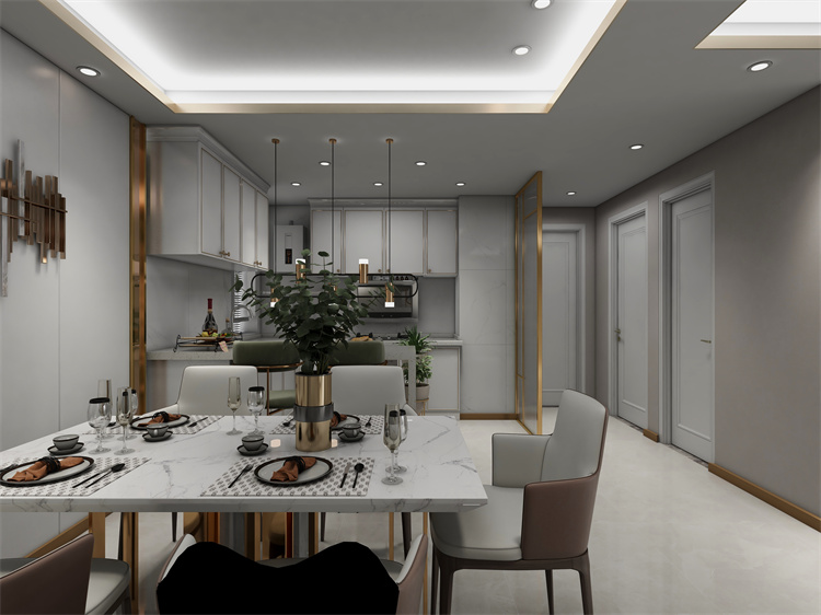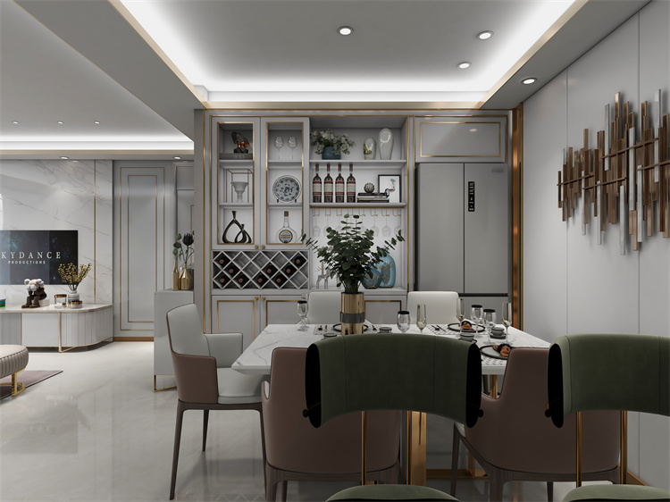 就餐區(qū)域沿用與客廳一致的白色及鑲邊處理,強調(diào)空間和諧感。墻面區(qū)域的簡單藝術(shù)擺件現(xiàn)代時尚氣息濃厚,為空間增添摩登色彩。