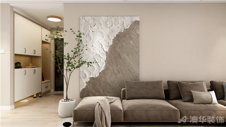 立體感強(qiáng)的裝飾墻面搭配造型獨(dú)特的布藝沙發(fā)看起來便很溫暖,客廳的綠植增加了聲氣的同時(shí)造型也獨(dú)特簡單。