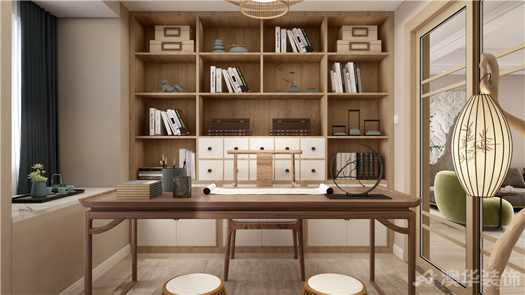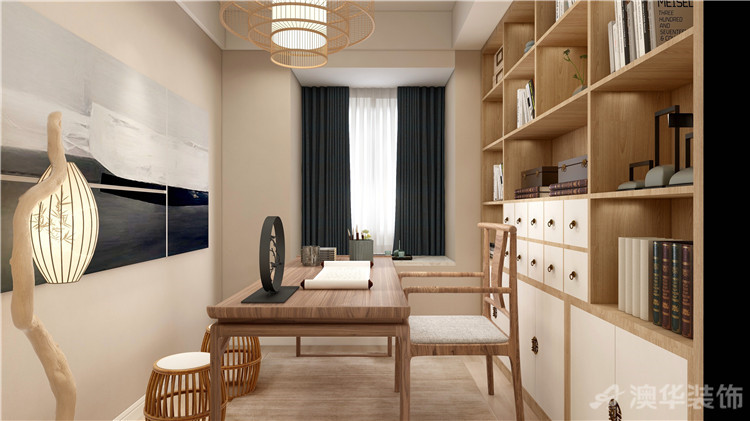 簡約的書柜以及工作的座椅可以感覺到現(xiàn)代的氣息,書房的燈也透露出來一種藝術(shù)感。