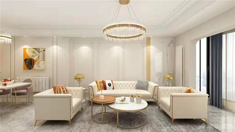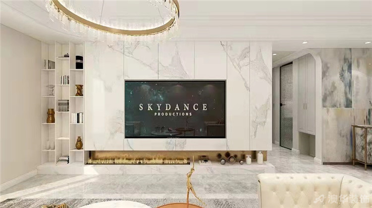 客廳與餐廳相互結合,功能區之間并沒有明顯隔斷,設計師通過燈具和背景墻的造型來進行分區,讓整個空間變得更加和諧舒適;電視墻使用了大理石鋪貼,并在左側增設了收納柜,讓客廳空間變得更加富有時尚感和層次感。