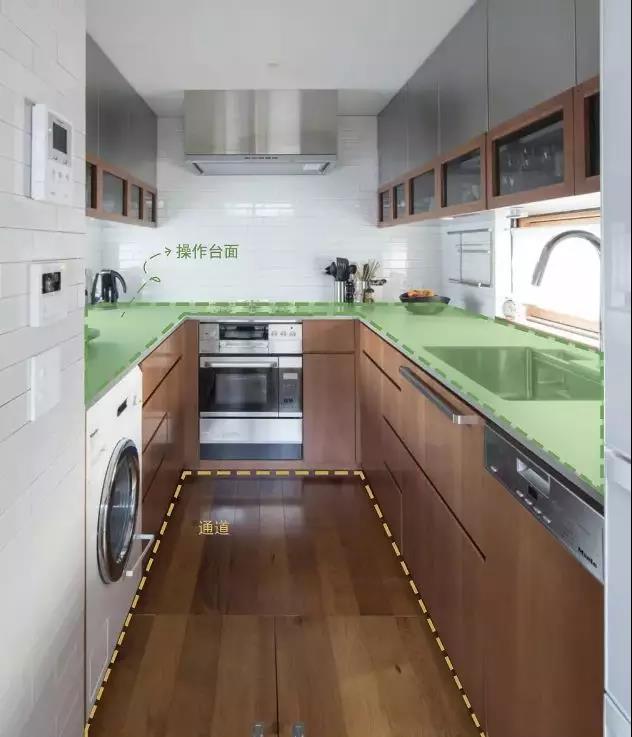 廚房其實就是櫥柜臺面以及走道空間的組成。操作臺面決定了廚房的收納容量,走道的大小則決定了料理的舒適程度。