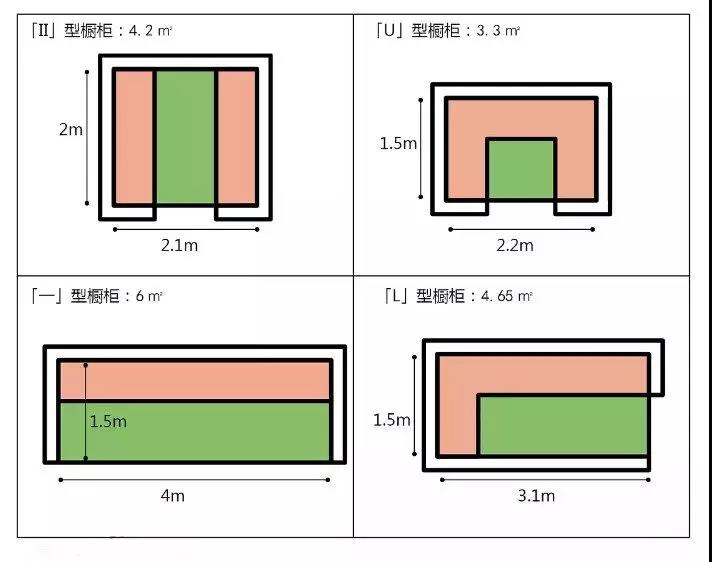 以4米長的櫥柜和0.9米寬的通道的封閉式為例,分別計算「I」 「II」 「L」 「U」 這幾種櫥柜所需的占地面積,最終得出下面這組數(shù)據(jù):