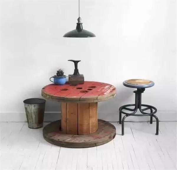一旦電纜線用完,電纜線盤就變成了廢物,但它可是茶幾的絕佳替代物。實木質感,粗獷的原始風貌,帶來濃濃的工業風。底盤堆放上一些書籍,又成為閱讀休憩的好地方。