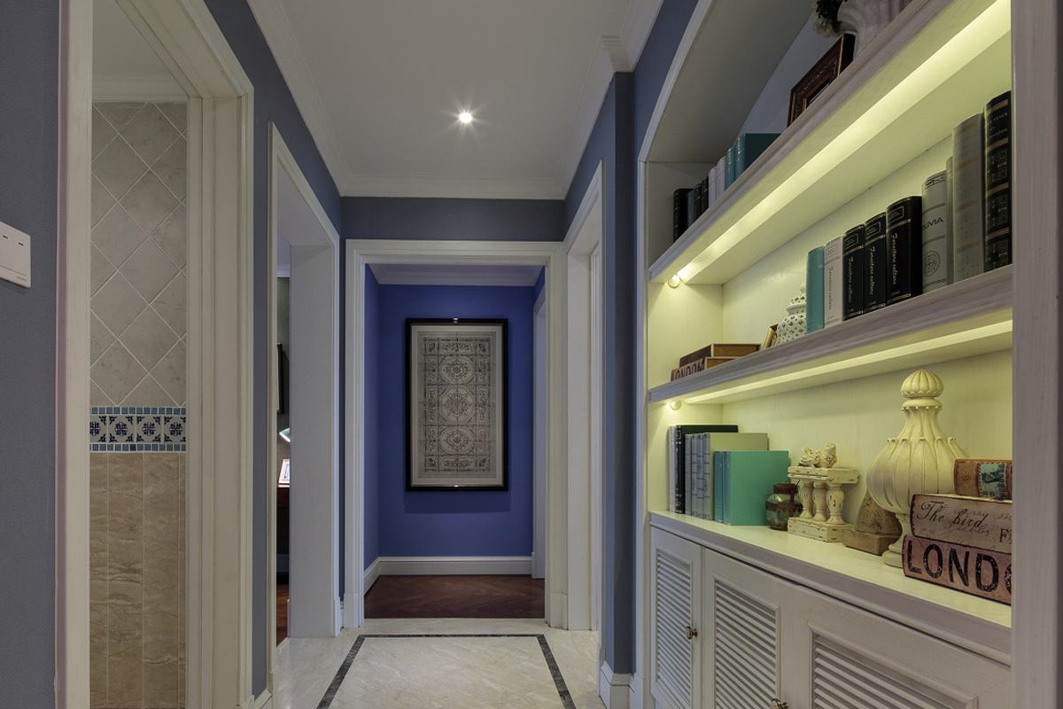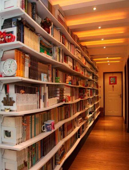 將走廊設(shè)計成美觀實用的書墻,既充當(dāng)了區(qū)域的屏風(fēng),又充當(dāng)了書本的收納區(qū),書籍在上側(cè)的擱架上被穩(wěn)穩(wěn)疊起,十分服帖,而這種設(shè)計,實則又是一種背景墻裝飾。
