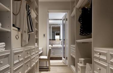 如果主臥無法留出衣帽間,不妨將非承重墻的那一面鑿開,設(shè)計(jì)一個(gè)嵌入式衣帽間。優(yōu)雅的雙開折疊門或百葉門,會(huì)讓衣帽間更有味道。