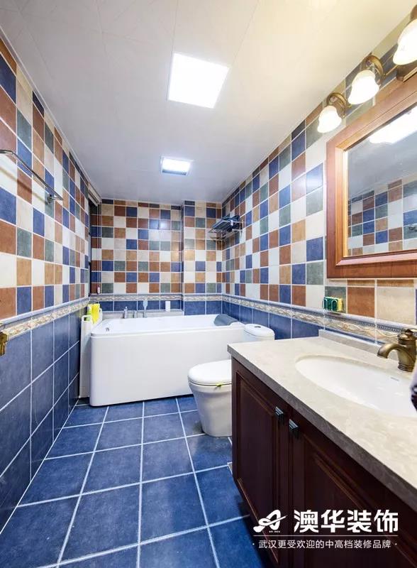 衛(wèi)生間摒棄了沉悶的色調(diào),以米黃、籃、棕色系打造出輕松愉悅的柔和氣氛,讓人身在其中會不自覺地放松。