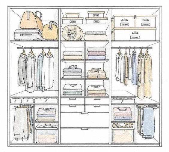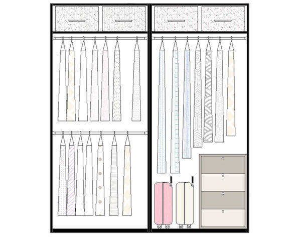 ? ? ??同時對目前的衣服數量與類別要有清晰的了解,由此確定衣柜的大??;對衣服進行分類,并為其安排合適的收納方式(平疊、豎疊、懸掛);根據衣服的比例分配掛桿、隔板、抽屜的位置與數量,并為后期的變動留出可以調整的空間。