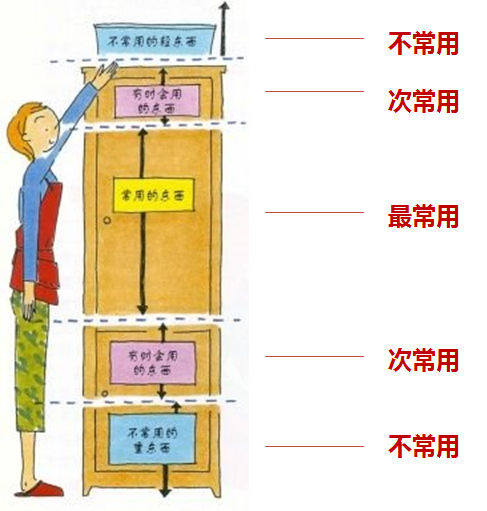 ? ? ? ??按照具體尺寸來講的話,在650mm以下,一般放小件的物品,在650mm-1850mm這個尺度設計為放季節性的常用衣服,在1850mm以上就設計為不常用的物品及換季的衣服。該規則適用于各種東西的放置。