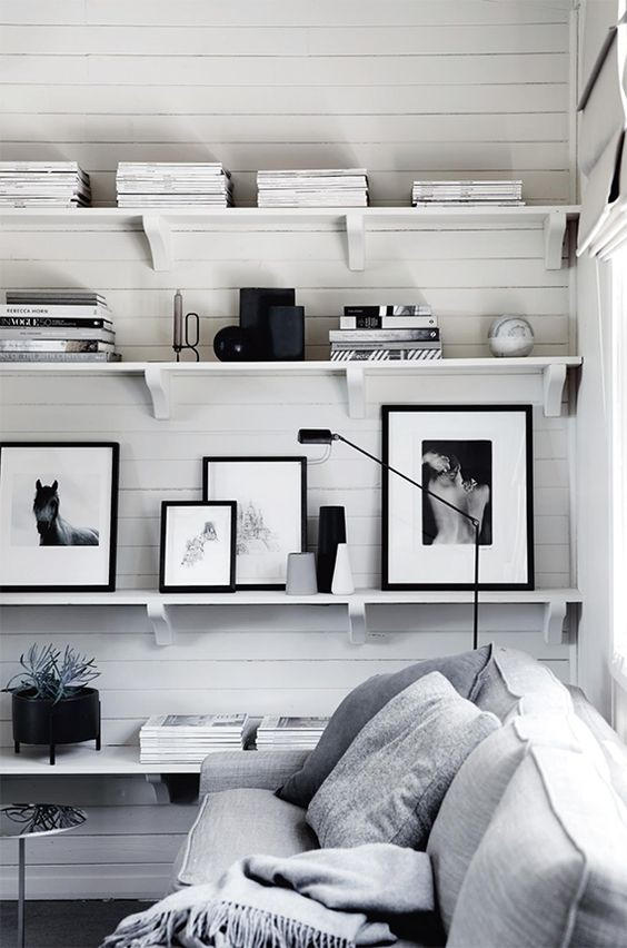 電視墻、過道、沙發背景這些地方安裝幾個置物架,把盤、碟、書籍等雜物收納進去,既節省臺面空間,又方便隨手取放。