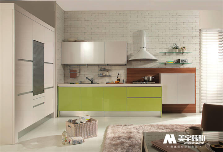 1.??一字型:櫥柜、操作臺和電器沿一面墻放置,工作都在一條直線上進行。一般小戶型簡約、后現代風格的廚房設計較多。