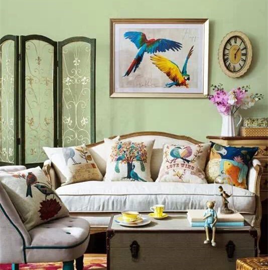 ??繪著鳥兒振翅飛舞的畫作讓單色的墻壁一下子有了動態的視覺效果,淺色的沙發上堆滿色彩斑斕的靠墊,為居室營造出一番熱鬧的氛圍,而茶幾上彩色的茶杯或綠植也讓客廳充滿生機。
