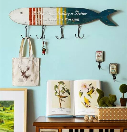 ? ? ? ?魚形的掛鉤板美觀又實用,若無大小適中的畫作,那大可以用繪有花草插畫的書籍來裝飾桌面,再配上綠色松鼠形象的仿綠植飾物,桌面上立刻變成童話森林的一角。