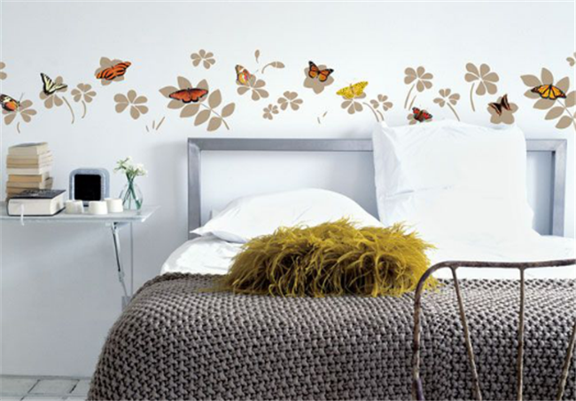 以剪影的花卉圖案壁紙為背景,將床頭裝點得活靈活現,讓簡單的白色墻面立刻變得活潑起來。