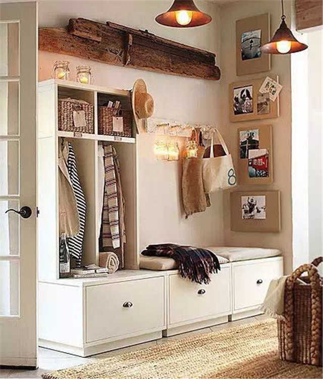 ▲-常規(guī)標準的一個緊湊形玄關:擱板、掛鉤、可坐鞋柜、小黑板