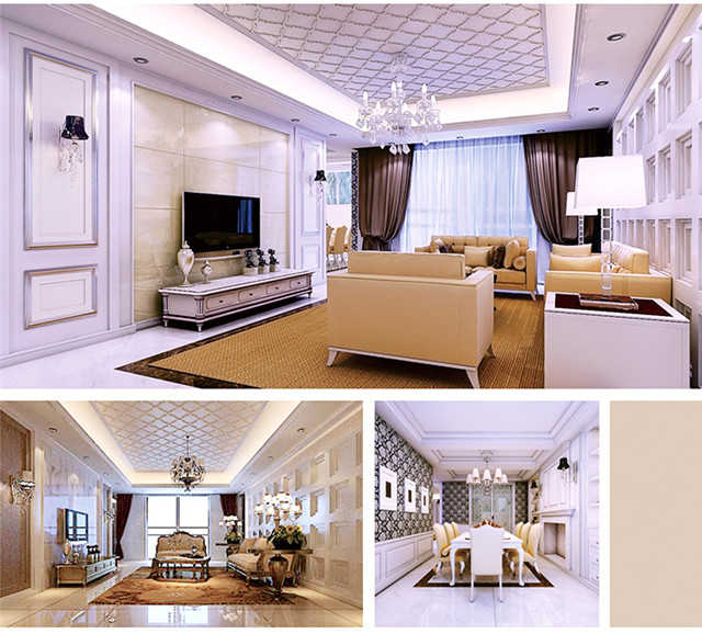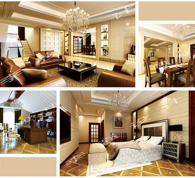 材質:拉毛粉飾、大理石的運用,使室內裝飾更講究材質的變化和空間的整體性。
