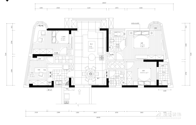 2、整合餐廳、陽臺與廚房,新布局容納中西廚、儲物空間,并與餐廳融合,實現(xiàn)多功能一體化。