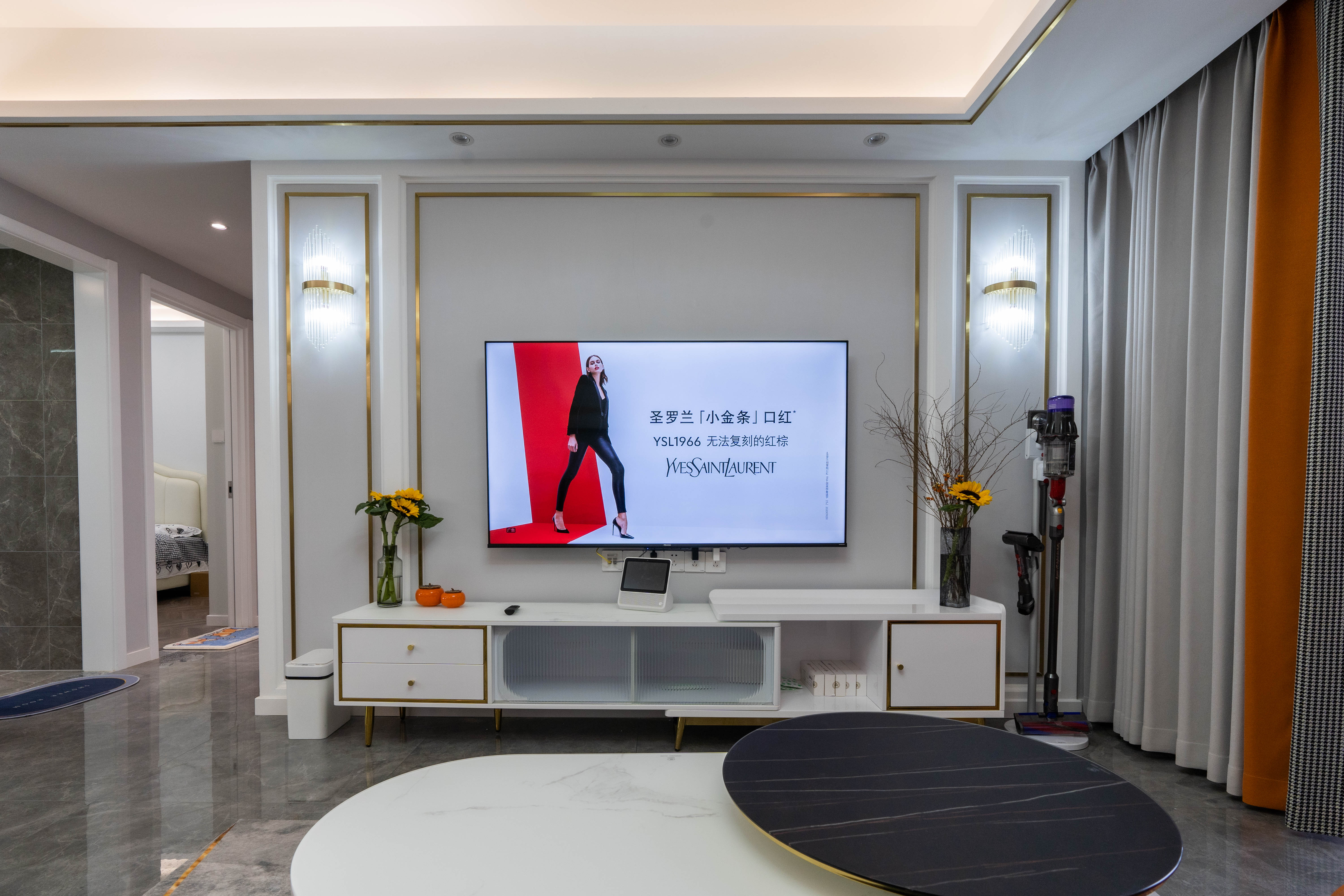 • 電視背景墻這塊沒有復雜的構造,簡單的幾筆線條即勾勒出層次感與精致感。這里女主人特意選了白色金屬小腿的電視柜,好看是其次,最重要的是方便打掃,無論是吸塵器還是掃地機器人,使用起來都非常的方便。