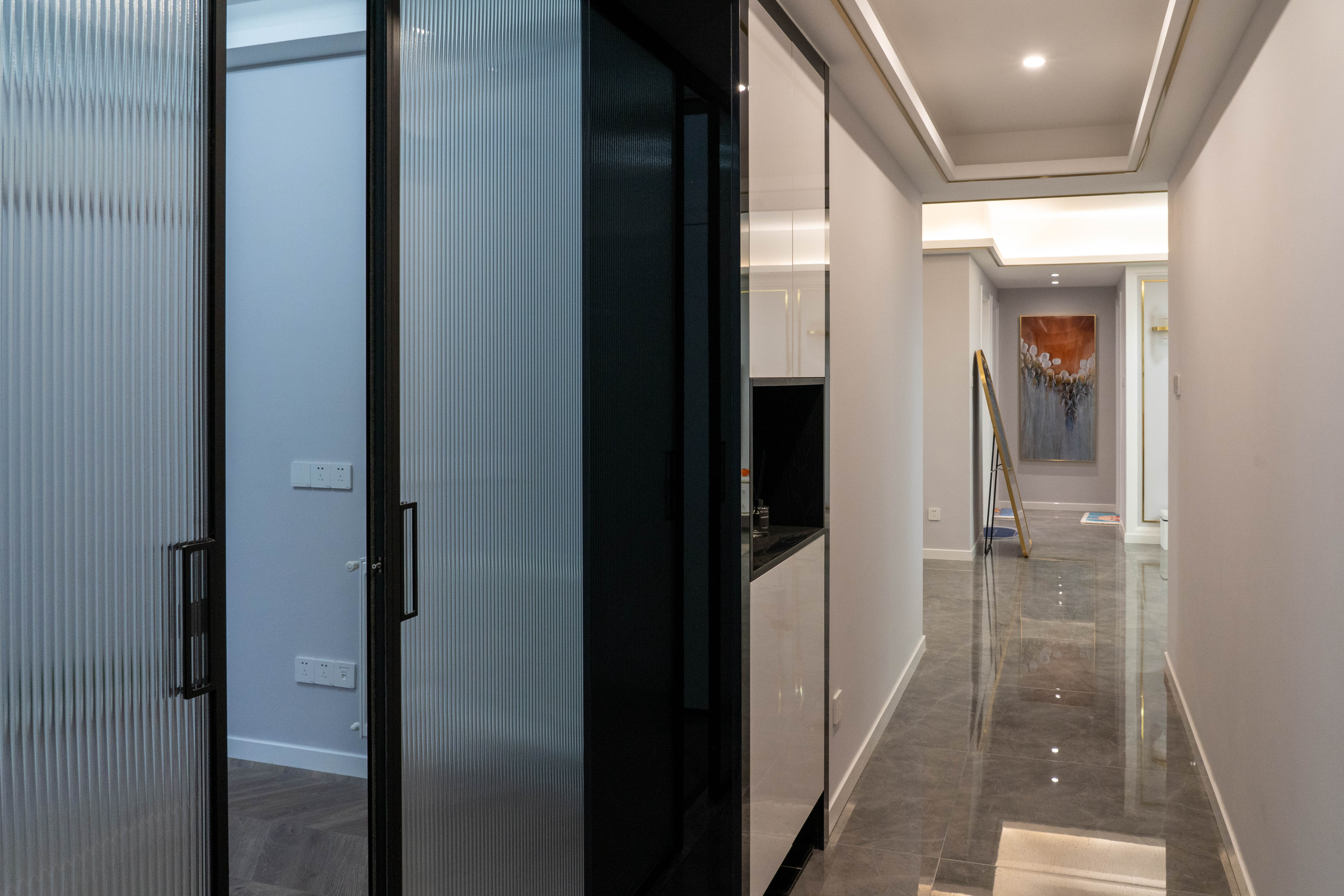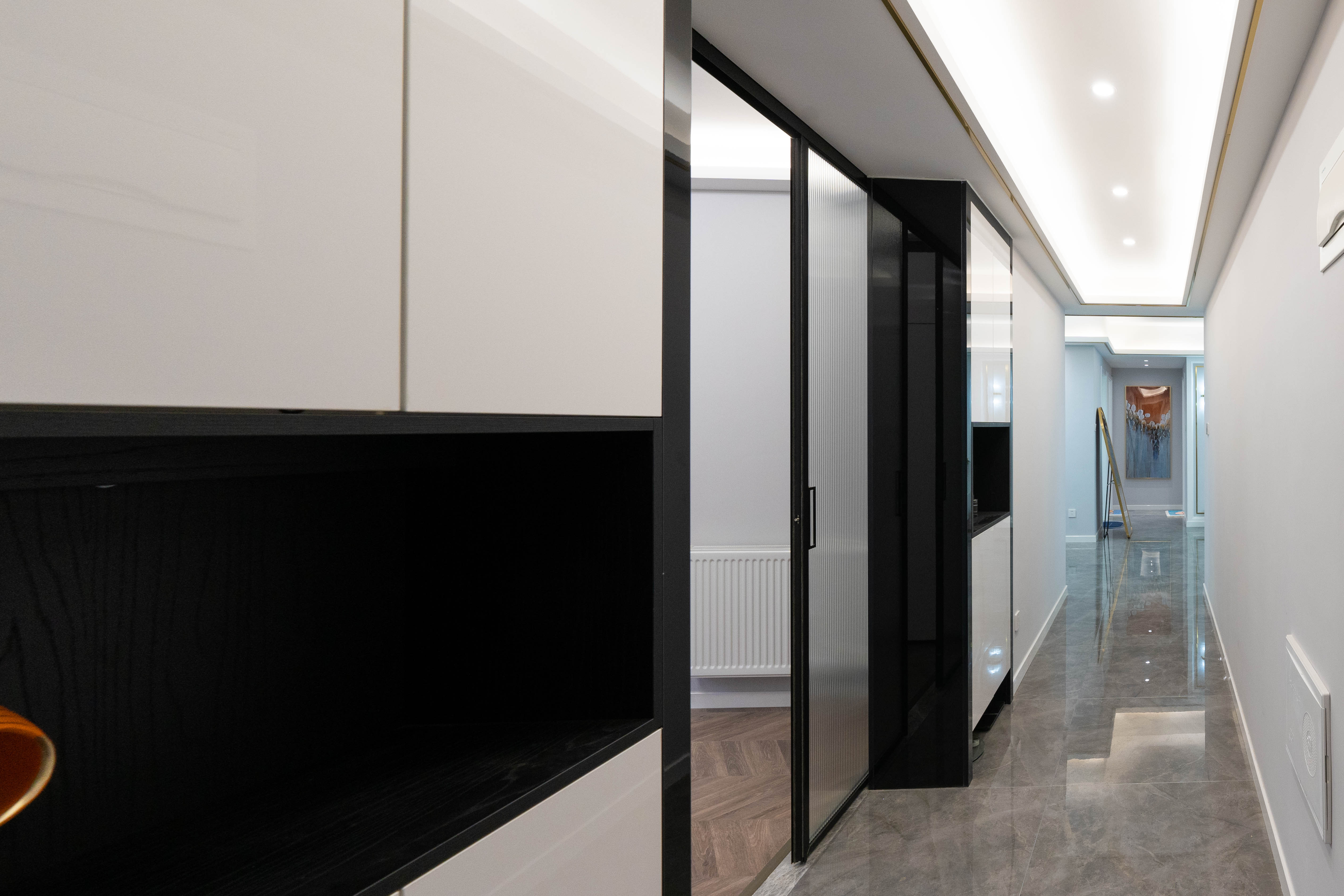 • 入戶走廊較長,將近5米,這里借用書房墻體做了兩面通頂鞋柜,書房采用上軌推拉門,有效改善了入戶狹長采光不好的缺陷。 黑白配色的鞋柜將墻體與黑鋼長虹玻璃門完美銜接在一起,過渡自然。頂部局部吊頂以金線進行勾勒,更具層次感的同時拉高了視覺效果,弱化了此處狹小的感官。
